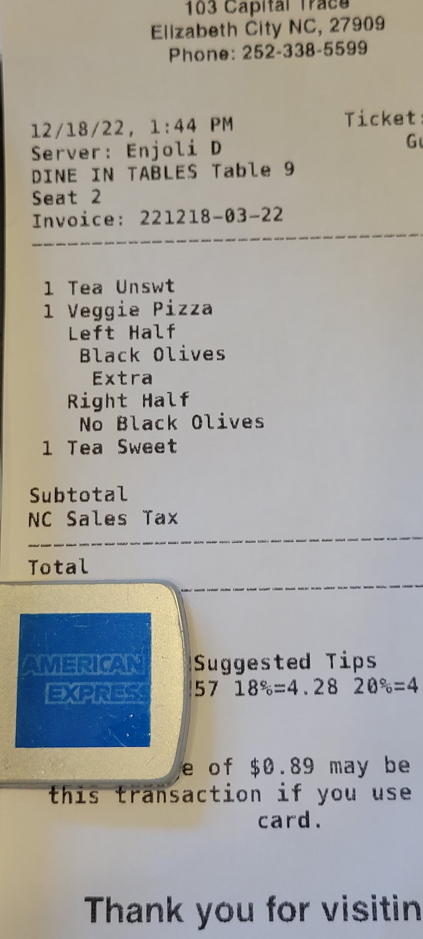 Read moreTO MUCH $ for too 'little' both in quality of the product and the service experience. I've gotten good subs from them in the past and was hoping for a good pizza. I was disappointed in the food and the service. Requested NO onions in the Greek salad and got them. Was greeted swiftly, but 'just another customer' attitude by the wait staff was also disappointing. No flirting, no special treatment, no small talk, all business. Get 'em in, sit 'em down, get their order, serve 'em, charge 'em, get 'em out! What ever happened to the small town pizza parlor where you knew your wait staff and maybe even the cook(s)? So, I sat down, ordered a drink and after talking with the waitress, just decided to get it to go. Maybe I'm just getting old and cranky. This economy sucks! Has for almost the last 4 years! Let's keep America 'friendly'! The rest of the world be damned! I could have went anywhere else to get a quick pizza and salad and drinks to go and gotten the same treatment or just ordered it to be delivered. I most likely won't be back to dine in and I sure won't order a pizza. Again, just my opinion. Lot's of room for...