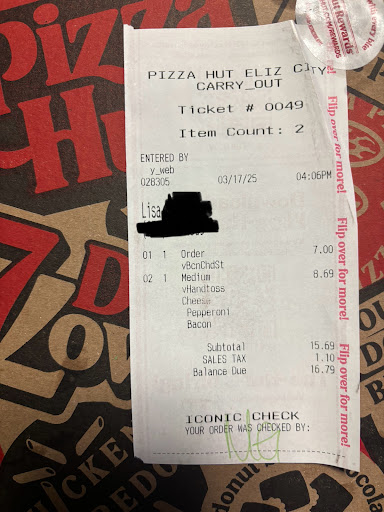 Read morePlaced an order online, I noticed on the receipt it says entered by “y_web”…not sure who put that there or why but that was interesting. Not everyone has time to call or come in to place an order and wait for it if they’re in a hurry. Also, I added bacon on my pizza, both the pizza and bacon cheese sticks didn’t have any bacon meat but only the fattiest parts and the breadsticks hardly even had that but had a veryyyy thick layer of cheese so I just threw it away. The bacon pieces on the pizza looked so old I thought it was sausage. Every single bite of the premade pepperoni pizza was straight fatty bacon….no meat….they just added the fatty pieces and added more cheese before reheating it to make it look like they made a new one. If the company can’t afford real bacon with actual bacon meat then why is that an option at...