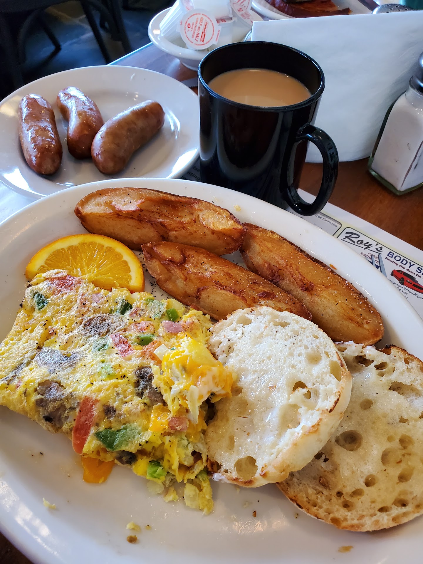 Medi came back with our coffee's: Dad got the house roast and I ordered the Wilbers Chocolate Roast Coffee, and then he took our breakfast orders. Dad ordered 3 eggs over lightly, a ham steak, an order of hash browns and rye toast. I ordered a western omelet with cheddar cheese, tomatoes and mushrooms, along with hash browns, English muffins, and a side order of breakfast sausages. Medi returned a few minutes later to tell us they were out of the popular hash browns, but he offered some other tasty recommendations which we settled on instead.