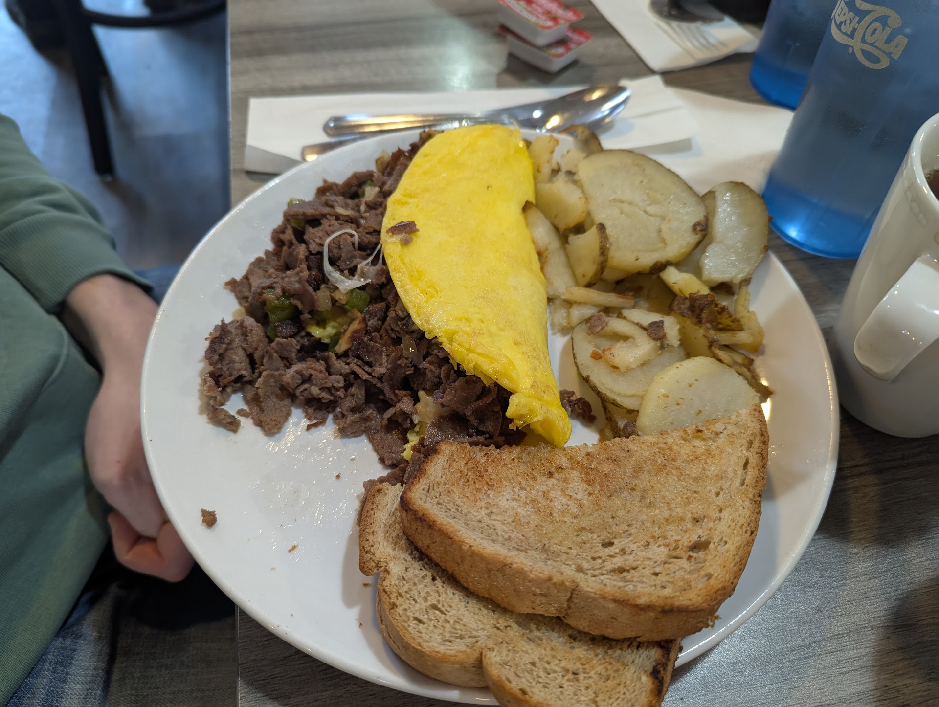 Stopped by here this morning after a grueling car ride with my teenager and two toddler sons. As soon as we walked in my 3 year old, who has autism, started snapping out and threw placemats and silverware on the floor when my daughter was trying to buckle him in a highchair. I was mortified but the server was so nice and understanding! We got french toast for the kids and my daughter and I both got omelettes. They were delicious and generous portions. I tried my sons french toast and it was very good! Service was fast and very friendly. It is rather small inside though, so I imagine it's pretty stuffy in there one weekends for their breakfast buffet. And I think it has the world's smallest ladies room, lol. All around a great place, we will definitely...