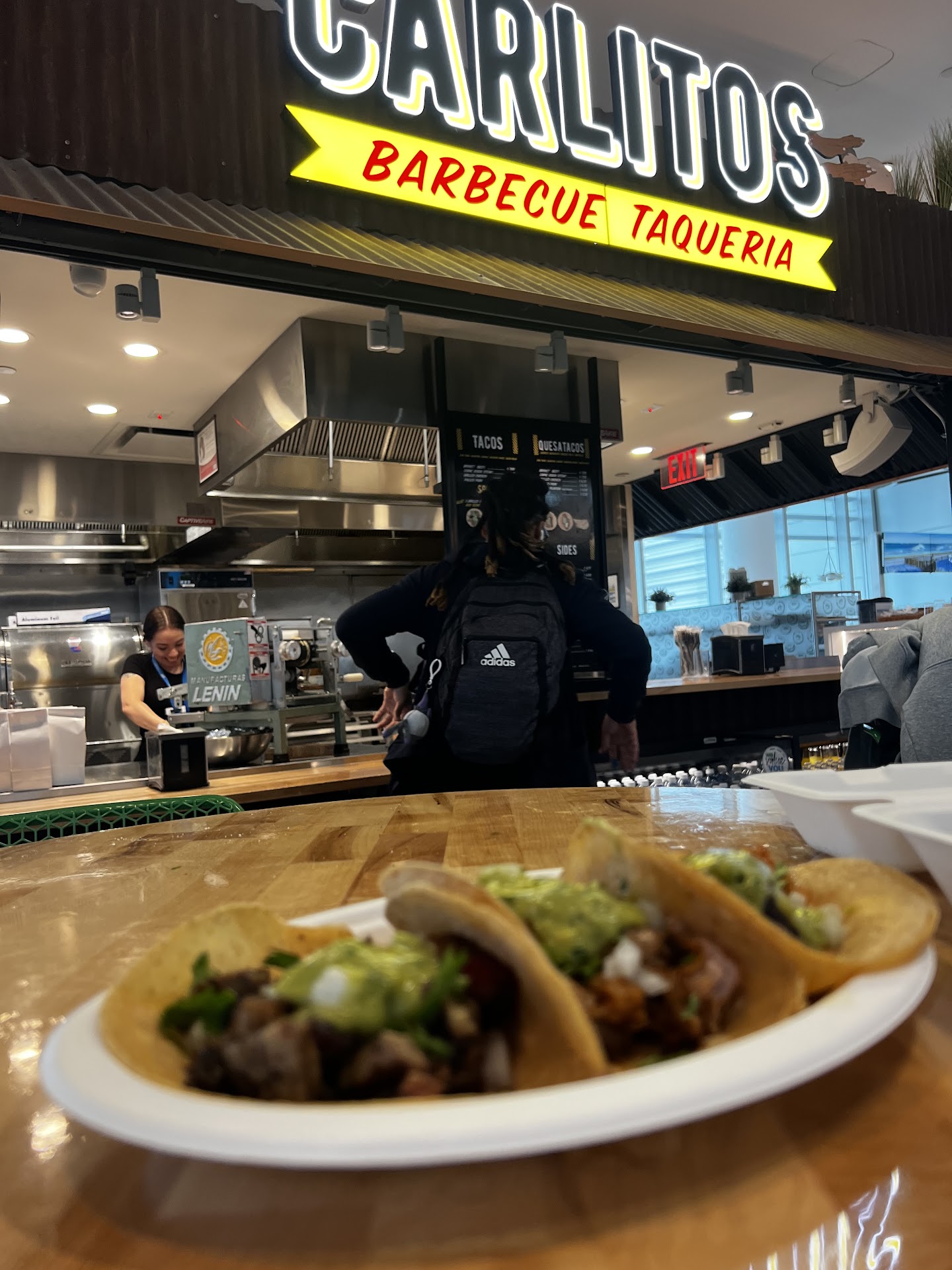 I like this place. It adds a nice vibe to the airport. The pulled pork taco was delicious. Not too juicy and the avocado sauce was delicious on all tacos that I ate. The sweet plantain taco was good. It’s cut into 2 thick pieces so I had to wrap the tortilla around the plantain like a hot dog which was weird. It would be a better bite if it had slightly smaller pieces of the plantain. The flavors were all there though. Now for the Brisket taco, the one I was looking forward to. This is the driest Brisket taco I have ever had. The pieces were chunky but not soft, it was hard and dry which threw me off. I took one bite and had to spit it out, it was gross. The aftertaste in it was more chemical than BBQ.