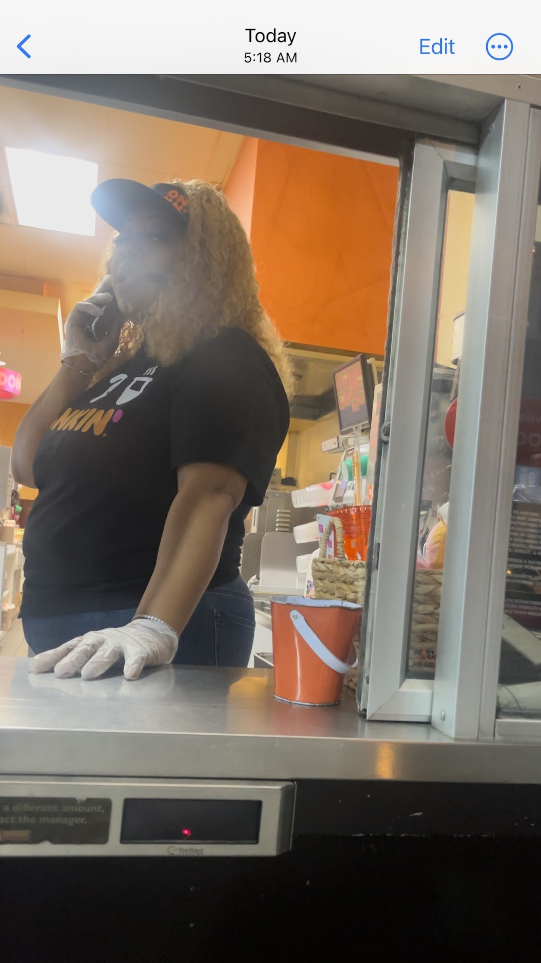 I go to this dunkin donuts around 2 times a week and never had problem with the staff. They alwsys nice and I go because they always make my coffee so good but today around 5am something this lady right here was in the speaker. First I came to the drive thru and wait around 10 mins but noone said anything. I said hello 3 times and noone answered So I thought that the speaker was not working and I went to the window. When we got to the window I told the lady nicely why I went to the window and she just told me with attitude that she didnt go to take my order. I told her that I wait 10 mins in line and she should at least said something. If she had told me to wait a second I would have waited But she didnt. I told her Im not going to leave because I need to order and she told me I will have to move my assss because she was going to call the cops. I told her she could call whoever she wants because I wasnt doing anything wrong. Im going back to speak with the manager of that location and show her/him the video I recored because this is not the way you treat your customers. I always go in group and spend money there to be treated like that. Im not coming back to this location if after I show the manager the video she mentiong my asss and everything if the manager doesnt do anything about it. I do not lose anything because I can go to another location But they going to lose 4 customers...