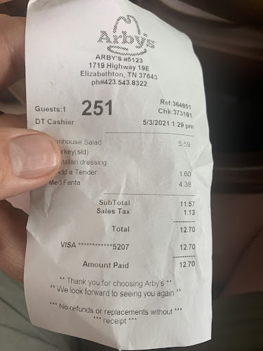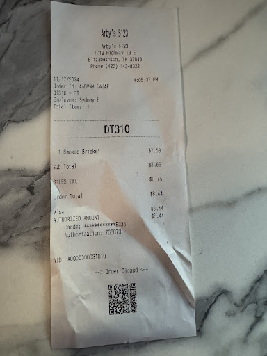 Read moreAbsolutely horrible!!! I love Arby's but this is the worst experience at any location. I'm a 63yr old retired restaurant mgr and I know what to look for in food quality. I ordered a buffalo chicken slider, 4 piece mozzarella stick, roast beef slider and a coke. I can guarantee you that the chicken and mozzarella were re-dropped. There is absolutely no disputing. Mozzarella was like rubber. No stringiness whatsoever. Chicken was the same. Barely warm. Here is how I know that they were re-dropped. From the time I ordered, paid, and received product there was not enough time to fry requested items. What a shame that this location does this. I always have loved both items and know what they should taste like. This was not it. A customer should always be served FRESH product. Regardless if it ordered as your last order of the night. Arby's is not cheap to begin with, but I just wasted $13.02 of my hard earned money!!!! Customers pay YOUR WAGES FOR QUALITY FOOD!!! WITHOUT CUSTOMERS YOU WILL HAVE TO CLOSE YOUR DOORS!!! SO SAD EMPLOYEES ARE LIKE THIS AND SHAME ON THE MANAGER FOR ALLOWING IT...