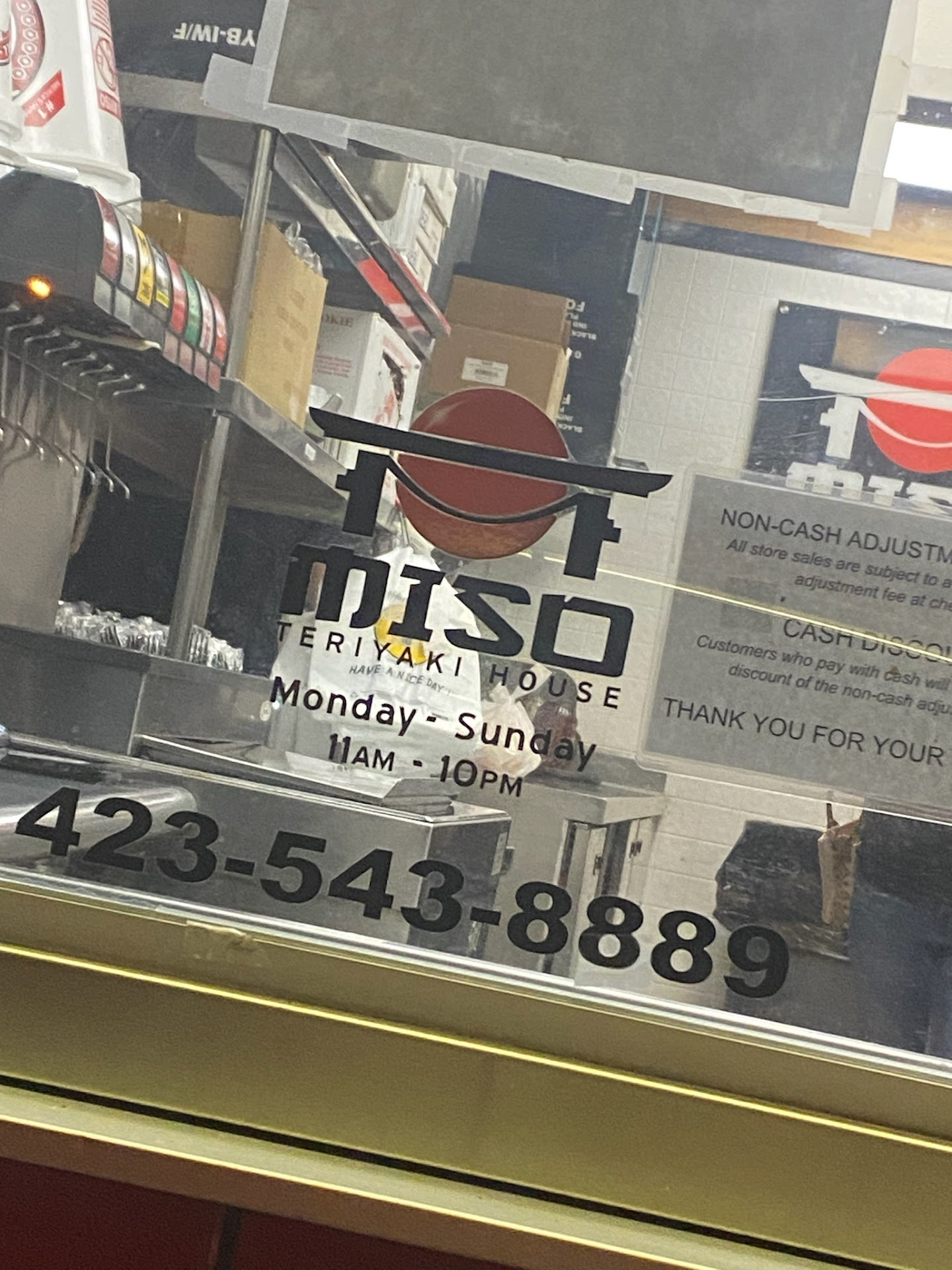 Give Miso a Hard Pass Live review: 12 noon on a Saturday. Just one waitress? Luckily, the counter/drive-through guy helped her out and bussed tables. Cute little place. Not what I expected. Only one table seated and they walked in just before me so I stopped in the restroom. When I sat, the waitress disappeared into the kitchen with the order for the other table. It took just enough time for her to come back for me to look over the menu and reviews. However, two tables sat before she came over. She took the orders from all three tables before putting any of them in. Efficient? Not to customers. Thought about a bento box but ordered the Miso starter and yakiniku with carrots and fried rice and hot green tea. Five other tables were seated before I got halfway through. Seven tables vs one waitress. Simple soup was brought to my table as I ordered, nice touch. Tea came in a coffee mug with a tea bag and charged me $3 for it. Starter plate is on a real plate but with a fried basket paper over it. Grease goes through the paper so why ruin the presentation with it? The food is so greasy, it's dripping. Fried dumplings are wonderfully crispy, but very light on filling. The sauce for them is tasteless. Crab rangoon is extremely too sweet and watery. Egg rolls are pretty tasty. Duck sauce is also extremely watery. As a matter of fact, I don't think i've ever seen duck sauce drip like water. I suspect theyre watering it down to make it go farther. Steamed carrots are good enough. Fried Rice is actually white rice that has been cooked in a brown sauce. It is not fried rice as there are no vegetables in it. It's also not a sticky rice and all the grains just fall apart and it's practically impossible to eat with chopsticks. Yakiniku is very tough and is just fried meat covered in sauce, not meat cooked in sauce. I will sometimes reorder, but I rarely just send back. I sent it back. The only thing to keep me from going hungry when I stopped for lunch is the egg rolls. They're not just simply filled with cabbage and a bit of meat. They are full and filling. If it weren't for the watered down duck sauce they would be a meal in themselves. Though they are also dripping with grease. Waitress did not bother me between every bite. It was probably because she was so busy, but she had the good grace to just make sure I have everything I need and leave me alone to eat. $17 for 2 crab, 2 egg roll, 2 dumpling, and...