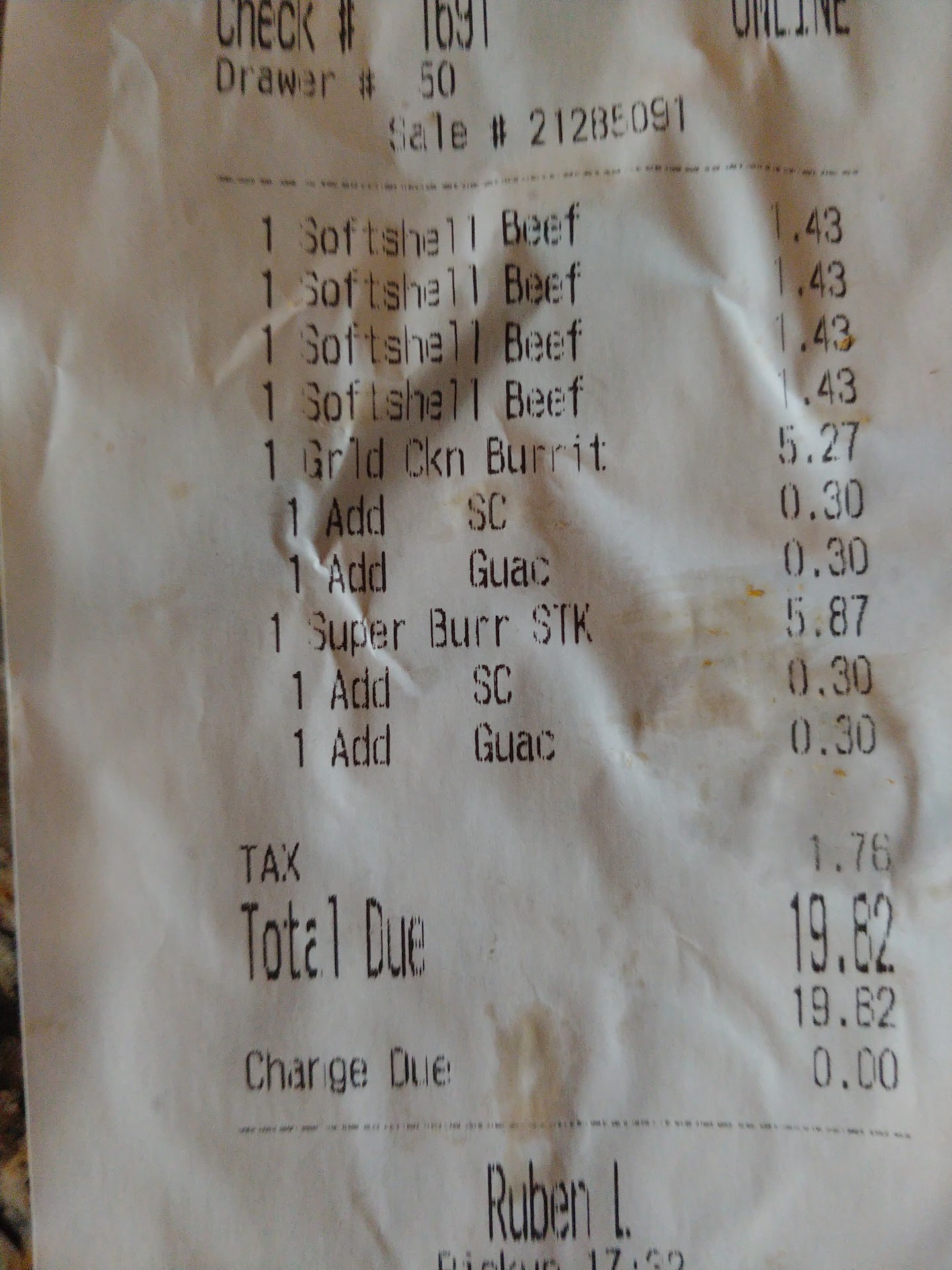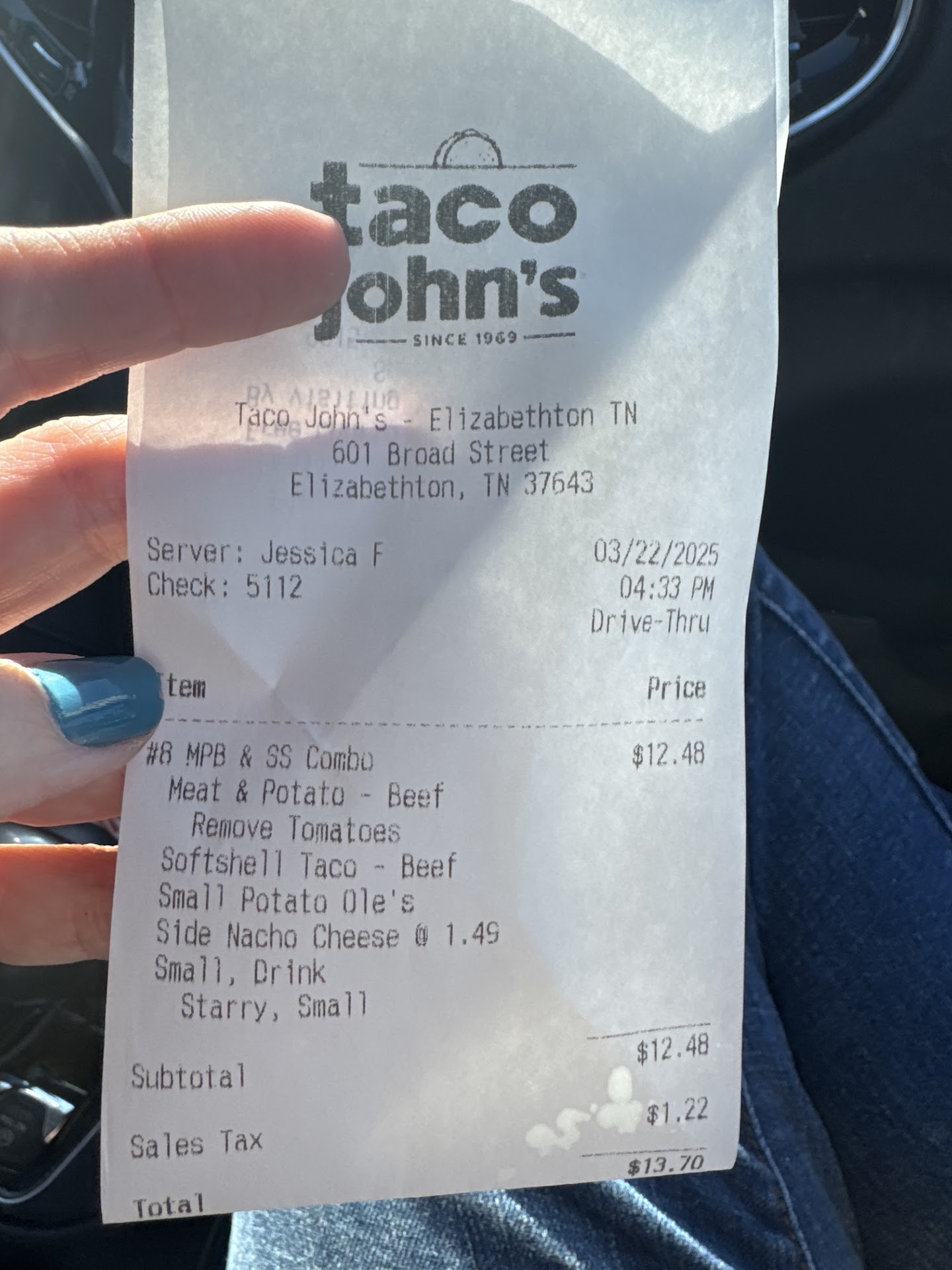 Read moreWalked in, restaurant was empty except for an employee sitting at a table on her phone. No one was at the counter. Three minutes went by (timed on my watch), and no one came to the counter. I could hear distant rustling of plastic coming from the far back. I finally called out "is anyone here?" and a woman (Shift lead? Manager?) came flying out of a side office where she was hiding. She was very apologetic, and took my order. She berated the employee sitting at the table, for not calling out that there was a customer. You should never berate employees in front of others! Then, the lady asked me if I wanted nacho cheese sauce with my order, I said no. Turns out it was on my tray anyway and she charged me for it - something I didn't want. Three strikes, and Taco John's is out. Do...