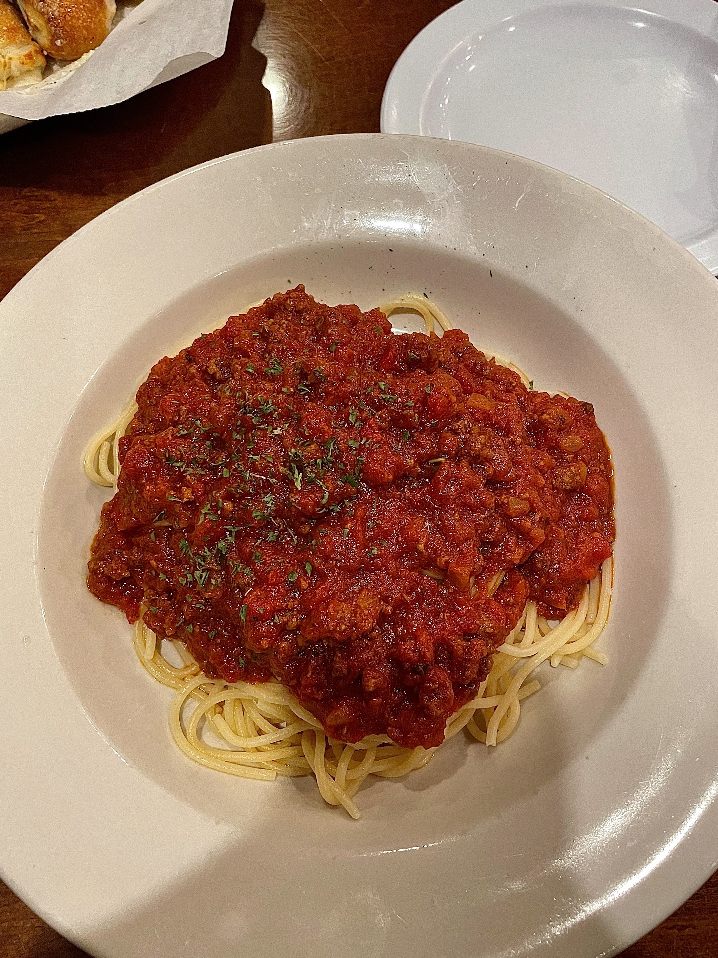 The spaghetti was cooked properly but the sauce was very bland. VERY bland. It tasted and looked like it had no seasonings in it at all. It tasted like they poured a can of chopped up tomatoes on the spaghetti.