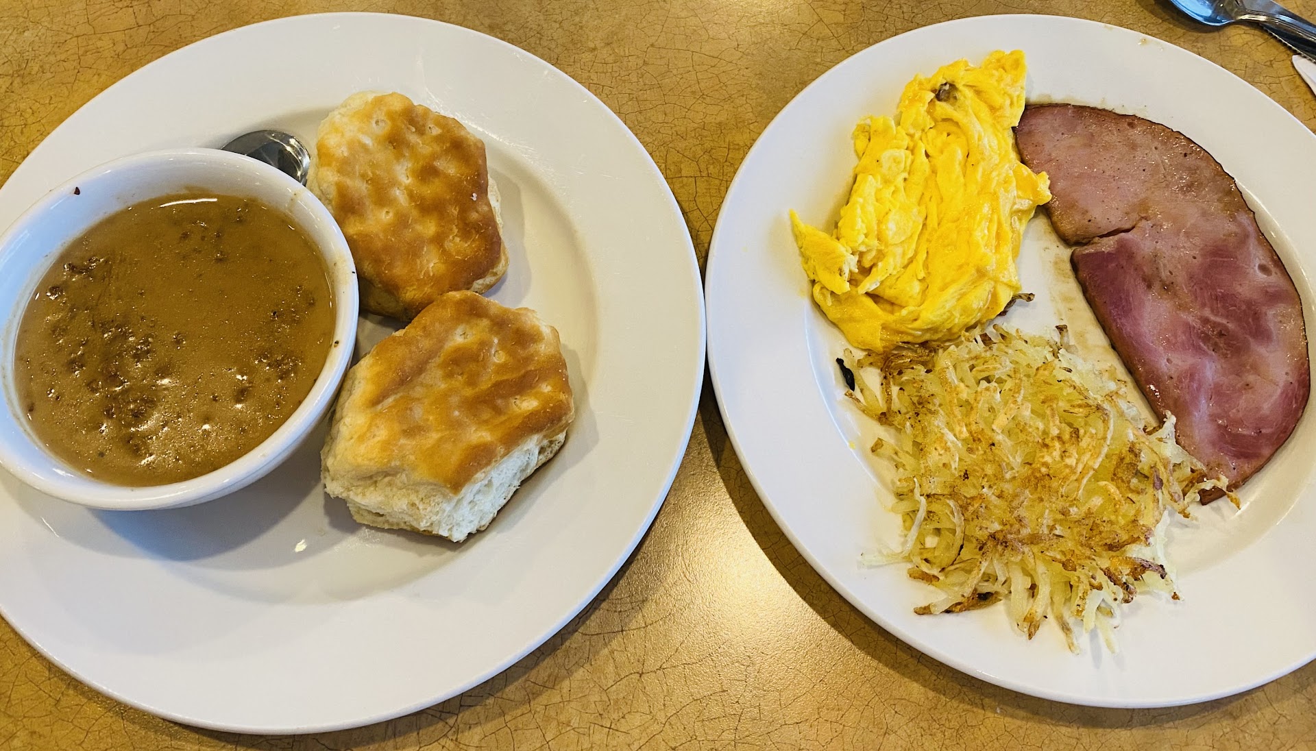 I was first sat at a table where I could distinctly smell urine, when the waitress came back I asked her if she could smell urine, and she said she could, she moved us to another table, and we ordered, the food came. It wasn’t particularly hot, very skimpy portions , the food was not cooked very well, and the biscuits were hard and cold. When I told her about it, she said she liked them that way, I really wanted to say something but I didn’t. She said she would deduct something off the bill, but then came back with some biscuits that were reasonable, she didn’t bring any for my wife, even though hers were as hard as hockey, pucks and cold. Also, the gravy that was on the biscuits with some thing like I’ve never had before, and it was terrible and extremely salty. It was really no apology for any of the issues, granted they were not her fault, but she turned around and sat somebody at the table that has a smell of urine without ever cleaning the booth. It was a horrible experience for the price...