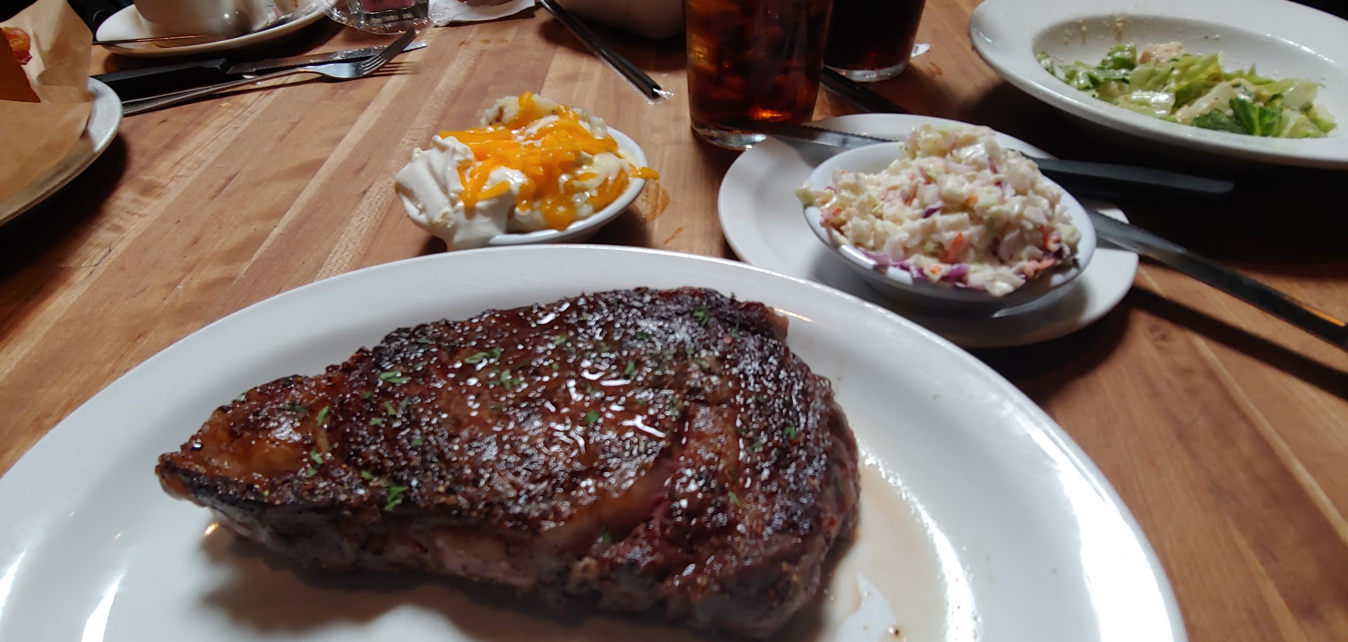 Thankfully, my motherâs meal had no issues, sadly mine had a few that knocked me for a loop. I ordered the âNEWâ 14 ounce Ribeye Medium Rare, side caesar, Loaded Baked Potato, and Homemade Coleslaw.