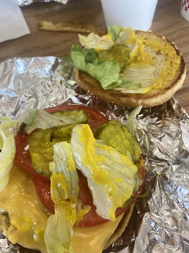 We have eaten here multiple times, usually in the evenings. Our burgers are always cold, cheese never melted on the burger or grilled cheese. The restaurant is dirty with a lot of young adult, employees talking, or avoiding work. The person taking our order was professional & greeted us. She also ended up preparing for with at least 4 other employees there. The last time we were in, an employee was sleeping at one of the booths. The young man that was supposed to be cleaning was running through the restaurant in a hurry and doing a horrible job. We typically love five guys, but this location doesn't compare to the locations we have eaten at in food, service, or atmosphere. I hate how unclean this location is...