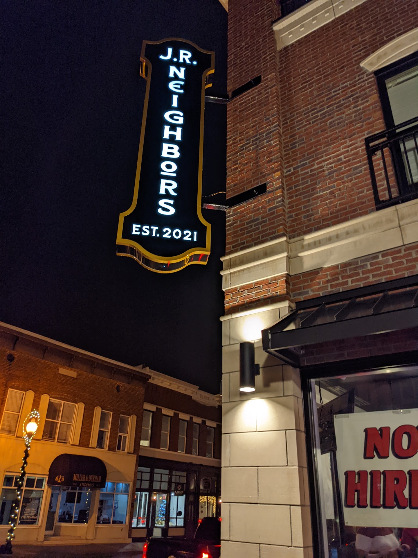 J.R. Neighbors is a welcomed addition to our downtown area. It's so new that I chose to overlook the minor shortcomings in my rating. The space is a collection of very well designed areas and the building itself not only blends into the historic areas but actually enhances the city circle. I look forward to visiting when the additional areas are opened, especially the upstairs bar. The place was buzzing with people on a busy Friday night but the well staffed operation functioned like a well organized restaurant. The wait time was minimal, about 30 minutes top. Our server, Cassie was cheerful and attentive. We started with two signature cocktails, Carrie's Ire proved flat and the smokey Old Fashioned had no hint of smoke. They were $8 each, which is reasonable even though they were less than inspired. I really wasn't hungry so I ordered the single smash burger with Mac and cheese, because I ALWAYS try Mac and cheese wherever I go. The burger was okay but the pasta was almost mushy. The cheese sauce was rich and tasty. I look forward to trying their bison burger and the elk burger next time. My dinner companion has dietary issues and was happy to have a gluten free bun for his veggie burger. The bun was very good but the patty was a bit tough. He loved the sweet potato fries and the dipping sauce is superb. The total bill was just under $50. I think the place will find it's niche in downtown and do well. I really hope so because Despite the few shortcomings, I enjoyed this upscale burger bar. Also Kudos to the clever choice of names! J. R. Neighbors' legend lives on in the inspired...