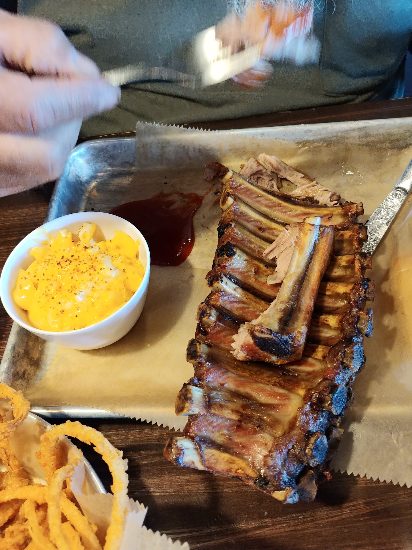 TLDR: Friendly/helpful staff, terrible cornbread muffins, good onion strips, overly-sweet wings, dry brisket, overly-barbecued and mediocre ribs, good pulled pork, overly-cheesy Mac-and-cheese, good fried sweet apples, and...