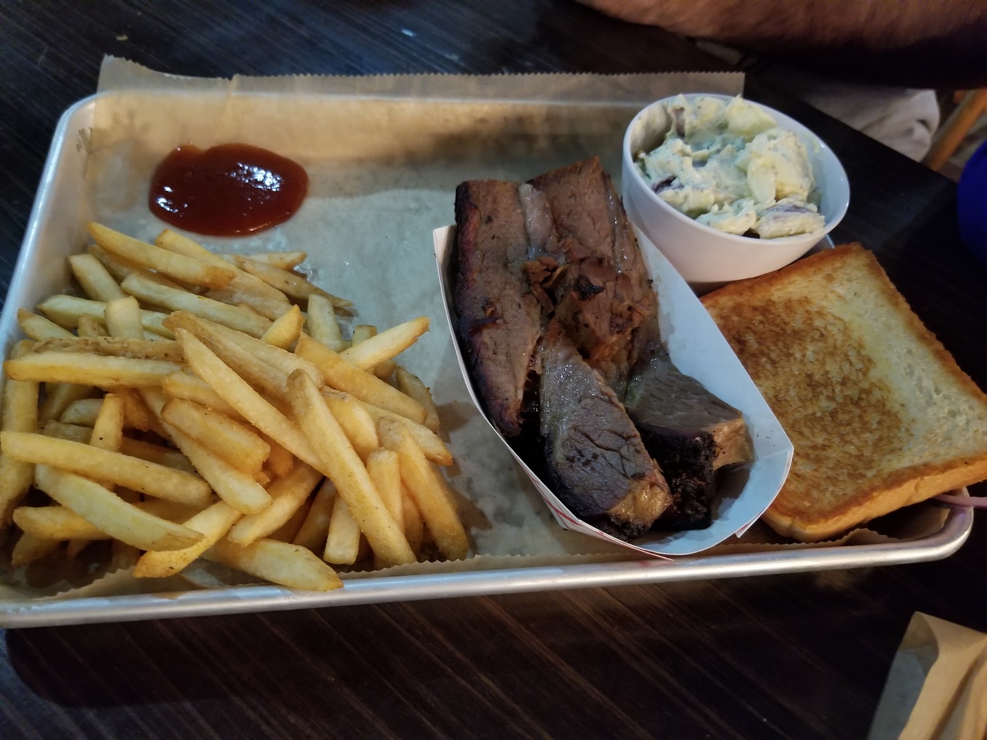Meat: The brisket is what we came for and were sadly disappointed in that as well. It was dry and bland. Tasted old and was hardly warm. Their signature barbecue sauce (vinegar base) was also not a saving grace. We were pleasantly surprised by the pulled pork. It was hot and fresh, tender and juicy. The ribs from the combo were not "fall off the bone" but that's not a deal breaker. The deal breaker was the over-application of barbecue sauce that was used and the obvious low quality in the meat. Was looking forward to the ribs, but now the dogs are eating them as I write this review.