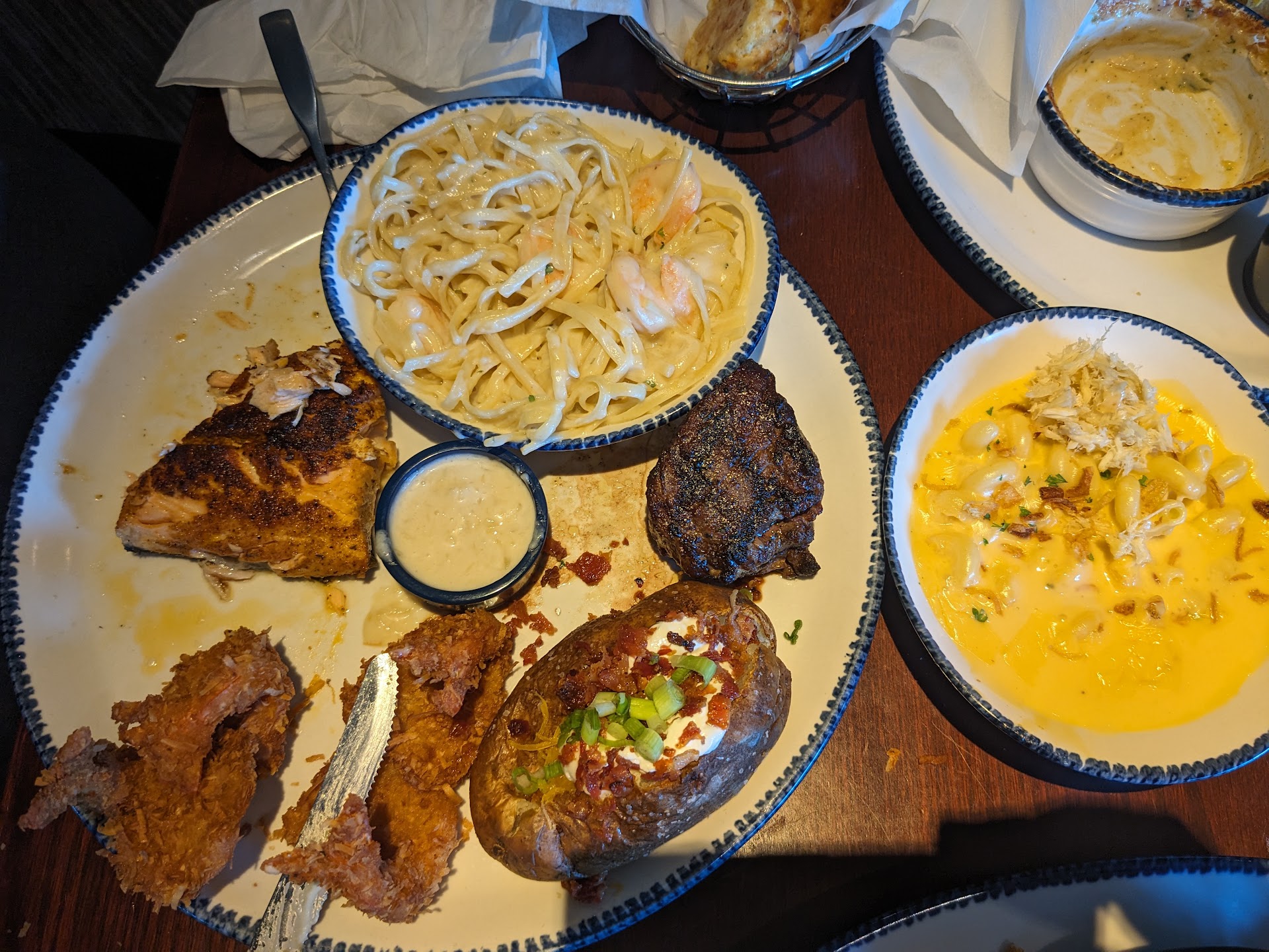 The hostess took our drink order (which in and of itself isn’t uncommon, but it was the first in this series of unfortunate events) our server took several minutes to come back and follow up with our beverages (which she NEVER refilled during the course of our meal) she may have been new, but wasn’t knowledgeable on their current Crab Fest promotion as we ordered directly from it and had issues (our requested flavor of old bay/garlic parm was given as a dipping sauce on the side instead of being added as part of the cooking process like usual) two members of our party had salads as part of our meals, and they were not delivered until literally ~2 minutes before our entrees, making them almost pointless one meal was entirely incorrect, and the additional side we requested was not entered three other servers brought our food out, and one of them offered to refill one drink