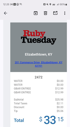 Read moreWell let's see where do I start. Ok we first get there get seated only one waitress was working she was also bar tending and bussing all the tables. She was wonderful there were others there but none were working at all they just kept calling this waitress to do everything. But that was only a small part of this visit, a fight or argument broke out in the kitchen with a lot of swearing and screaming the whole restaurant could here it. Very unprofessional. Then we finally ordered and I ordered a bacon cheeseburger plain well done but not burnt. When it finally got to our table which came with our appetizer, the cook I think was trying to be funny or something, my hamburger was burnt beyond belief and my bun was burnt also. Our waitress was so tied up with everything that she never made it back to our table to even check on how our food was. I ordered tea which came in a very dirty glass. Made me sick to my stomach seeing it after I had drank most of it. We sat at our table completely done eating waiting on our check which was at least half an hour, again not our waitresses fault I truly felt sorry for her with how she was being treated by her co workers, my husband even commented on how sorry he felt for her. As she is trying to check us in a big party of 5 walk in so of course she needed to seat them then a party of 4 walked in which was actually another waitress that had asked for the night off so she could go to the fair. So our waitress went to take my hamburger off the bill while that was being done she seated both groups, she walked back finally to us to finish our bill and one of her coworkers who was walking around like a zombie on drugs tells her to do something else and our waitress replied I have a 4 top and a 5 top that needs drinks so it will have to wait. Needless to say we are done. Ruby Tuesday could do much better but this was horrible. We will not be returning for a very long time if ever again at all. BTW our waitress was given a 22% tip for being so kind on the situation she was put into. I really don't know how this location even stays open. Absolutely the...