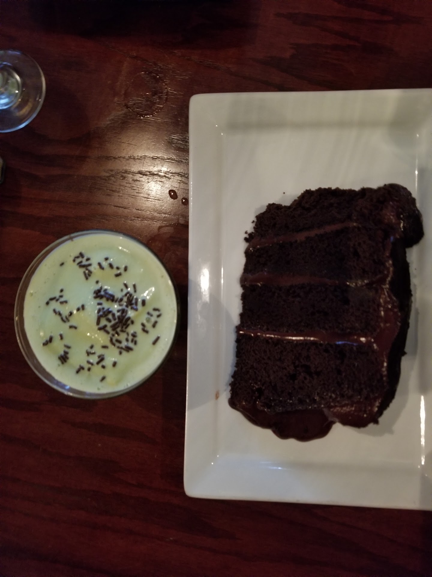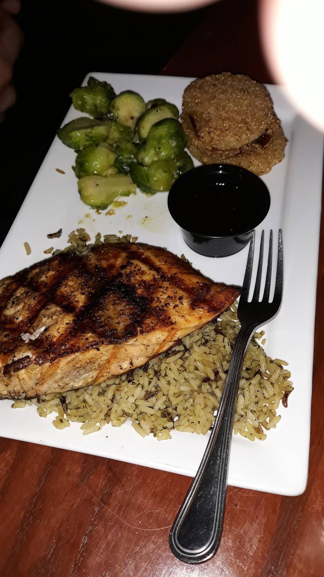 I had the salmon and my wife had the shrimp tortellini. She said the shrimp was a bit overcooked and the sauce was thin and shrimpy tasting, but I liked it. My salmon was a little overcooked also and some bites were dry, but it was very tasty. My wife and I both enjoyed the smashed potatoes and chocolate cake (separately 😉). The fried green tomatoes were acceptable but not particularly noteworthy except for the raspberry pepper (jalapeño?) dipping sauce served with them that added a nice flare. Also the bar tender did an excellent job mixing my blackberry margarita and grasshopper.