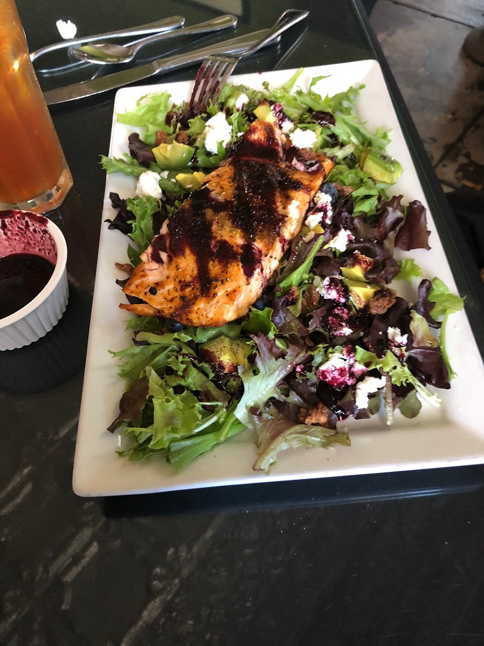 I feel like this place is struggling to come into its own. Both the hostess and our waitress seemed on edge and barely cracked a smile (though I saw a waitress at another table smile every time I saw her approach her table, so apparently smiling is not prohibited 😊). When my wife asked to substitute the salad that came with her dish for a baked yam, our waitress said that we would be upcharged,which we agreed to. What actually happened is that we were charged the full price for the side as though it were ordered separately, my wife did not receive a salad or a discount on her main course, and she only received HALF of a baked yam! When I asked our waitress for a drink recommendation to pair with my salmon, she seemed lost and unprepared to answer the question. My salad was served nicely presented with an artful drizzle of house made raspberry vinaigrette, and then the waitress unceremoniously plopped down a bucket full of pre-packaged club crackers next to it. These things suggest the indecisiveness of the restaurant's character and direction. The bar thinks it's at the Cheesecake Factory. The kitchen is straining to catch up with the bar (and it's very close). And the front of the house thinks they work at Cracker Barrel. With a little more finesse in the kitchen and some attention to the front of the house, this place could become something truly special. I hope...