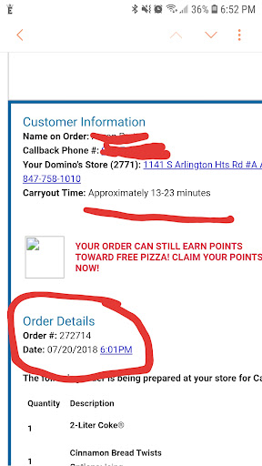 Read moreYes I know it is busy on a Friday night but when you give someone a time when it is ready you should expect it to fall within the time. (See attached pictures on review). I worked for Dominos about 12 years ago and this location is not organized by any means. There was a girl up front that didn't look a day over 10 years old that all she did was put tags on boxes. Not acknowledge anyone up front or answer phones literally tag the boxes was it. A lady walked in about 5 minutes after me that ordered her pizza and walked out the same time I did. Luckily I checked my order because they forgot to add the 3 additional sauces that was requested on the order. Showed my order was 13 - 23 minutes it took nearly 40 minutes. ( see attached photos). IF I ever order dominos again it will be a different location since this location is so...