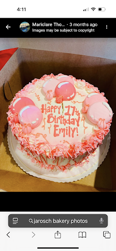 Update: We cut into the cake there was a hair in the cake will be calling jarosch tomorrow again. The chocolate part of the cake was dry there was barely any fruit in it. Sadly won’t be a customer of jarosch anymore this bakery has lost its ambiance & specialty. I miss the jarosch paper jarosch wrapping the small details. My dad even said this is the worst cake I’ve seen in 30 years from jarosch. I am very disappointed with the cake and the service I received today 9/20. My family has been customers of jarosch for over 25 years. We’ve ordered many cakes from here. I ordered a cake for my dad’s birthday, usually we do the flowers for decoration. Well I saw a cake with balloons and confetti on their website from 3 months ago the photo was posted so I thought oh that’s cute for my dad instead of flowers. I expected the cake to look similar to the photo on google. When I saw it I was shocked. I had a family member pick it up since I was working that day. It looks absolutely nothing like the photo and the balloons costed an extra $6 for the design. The confetti also looked atrocious. I called and the lady on the phone was very ignorant and rude saying it’s multiple cake decorators and she doesn’t know what photo I’m talking about she isn’t sitting in front of a computer. I said it’s the only photo with balloons on your site and it says happy birthday Emily on it. She wasn’t very understanding and said it’s not a machine doing it they aren’t all going to be the same we aren’t a factory. Her tone and attitude was rude and not nice no hospitality at all. The cake looks sloppy and rushed and just overall bad cake decorating. I’m hoping it taste better than it looks and that hasn’t changed as well. She gave me a $25 store credit . I expect more from this business you are a family owned business that’s been open for many years and your prices are up there too. An 8 inch cake I paid $52 for I expect more otherwise I would go to jewel or Walmart. I also drive 45 minutes just for this bakery and it is disappointing. You are a bakery making wedding cakes and cakes that cost hundreds of dollars I’m sorry I expect the balloons to look better than someone decorating at Walmart thought this was a special bakery...