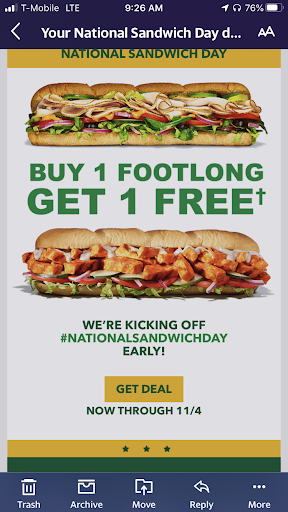 Don't go here to redeem BOGO sandwich coupon that's good through November 4th. The dude working there won't let you use it.. When I tried to use it he insisted that it was an online only redeemable deal, despite the couple clearly stating how to use it, when to and what for. I pointed out that it said you can scan it at the register, but when I did then he deflected to two buttons below the coupon that had nothing to do with the coupon it self... They indicated options to accept or decline cookies for my phone... Once he saw those then he started insisting that the coupon was for a cookie and not a sandwich. Let me stress that at the very top of the coupon code it said BOGO ANY FOOTLONG... idk if that guy was truly that ignorant, or if he just didn't want to honor the coupon. I'm under the impression it was the latter. I would have appreciated just a "we don't accept that coupon at this particular location" or something like that, although I would have assumed that was bologna as well. I still would have been annoyed because I went out of my way to try and take advantage of the deal. Not only I'm I annoyed that I wasted my time, but now I'm also left with a bad impression of the restaurant and the guy they have...