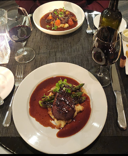 Entrees Wife: Pistachio Crusted Halibut (Fantastic, we both loved it) Mine: Ribeye Medium Rare (Though the steak was perfectly MR and very flavorful, this cut had quite a bit of gristle. I realize ribeye steaks have some fat marbling but this wasn't that. Much of it was tough to chew and I have had better cuts at Outback. Don't get me wrong, I still devoured it like a caveman and really enjoyed it but it simply was not the grade of meat you would expect from a Zagat rated restaurant.