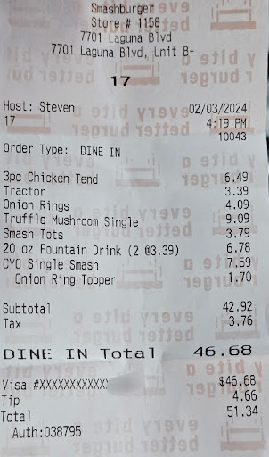 Read moreWhat happened to this place? I remembered when they first opened and it was always packed with limited seating and the food was actually good. We usually do In and Out burger (which I'm NOT comparing this place to) but they were extremely packed, my husband chose this place as our 2nd option, and boy was the burger and fries disappointing . Who ever is cooking obviously can't cook , the patty was so thin it was more than well done, dry, and burnt around the edges, with four sad Jalapeños slices, pepper jack cheese topped with wilted lettuce with some type of aoili sauce between the lettuce and bun( you could at least pair the sauce with the dry patty) the burger was barely edible.( I pulled off the burnt edges).And the smash fries were flavorless and stale. My husband didn't believe me till he ate a few fries and tossed the rest back on my plate. We dumped the rest of the fries, pretty much all smash fries in the garbage. Back in the day the smashburgers were smashed yet still juicy with twice the amount of meat ,not smashed to oblivion, burnt and dry. This place will be a definite pass in our burger joint rotation. Eating here today was...