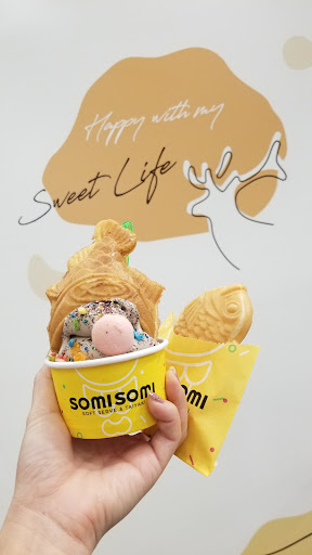 Food is always great! I mainly get the taiyaki and I really enjoy how crunchy it is without being burnt in any way. As for ambience, it's always a bit too loud in the shop. It'd be nice if they lowered the music, so that I don't have to yell my order to the staff. Usually the staff are great, prompt, and courteous. Tonight's staff crew (Angelbaby, Kelly, and a girl who had a lot of bruises on her neck) was lacking in the customer service department. I placed my order, then had to take my kid to bathroom. We were gone for about three minutes, then I returned to the counter area, but none of the girls acknowledged my presence even though all three of them made eye contact with me at some point. They stayed clustered together and away from the counter area, so it was difficult for me to talk to them due to their distance and the loud music. I waited a few more minutes just in case my order still wasn't ready. Kelly made eye contact with me three times, but never asked if I needed any help. Finally the girl with the neck bruises got close enough to the counter, so that I could talk to her. I asked her if the order for Kim was ready. All she said was, "Oh yeah." No apology and just handed the box to me without asking if I needed a bag (usually SomiSomi staff offer me a bag and are polite). The experience makes me regret tipping them when I paid...