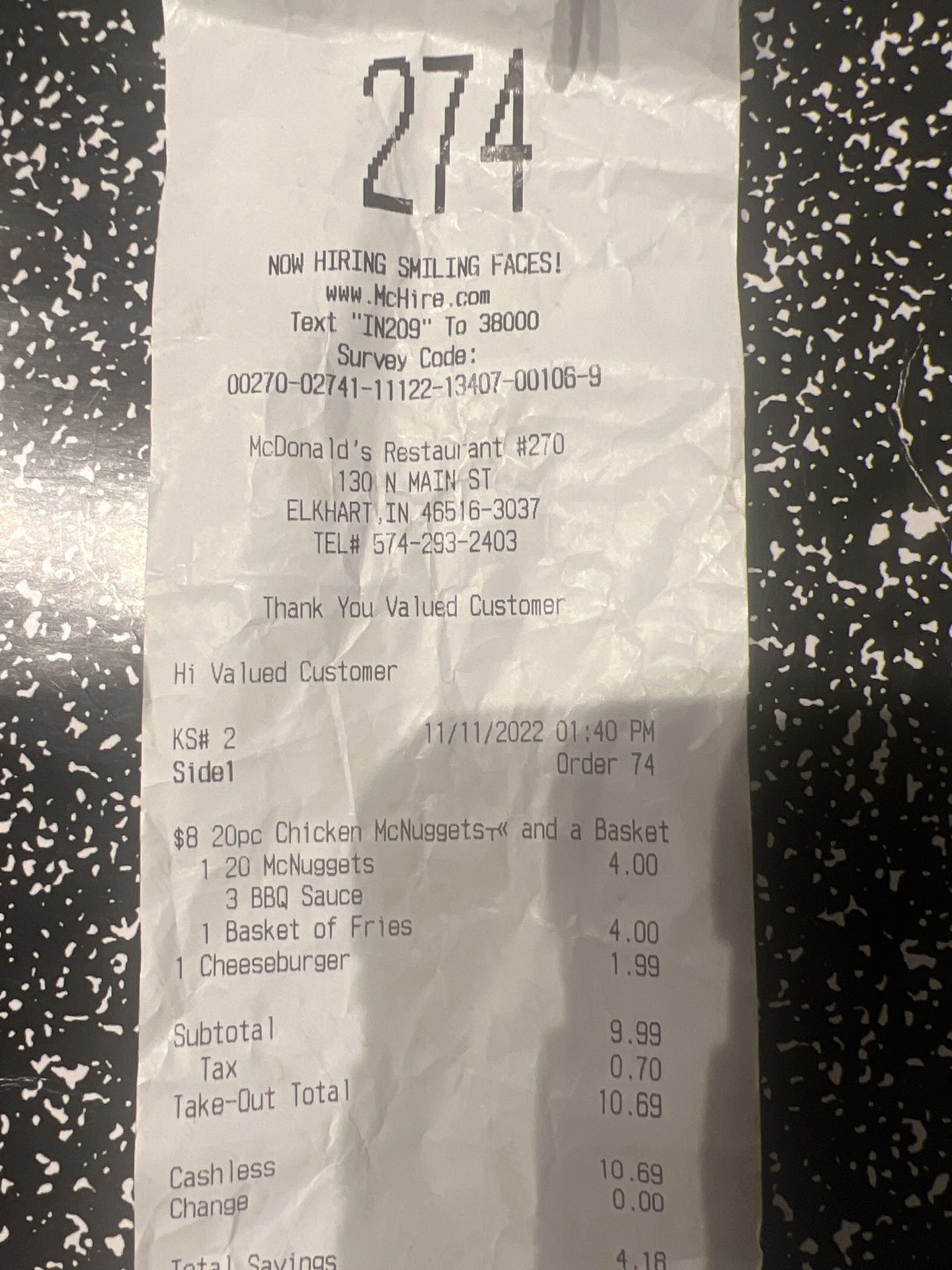 Read moreSo I've frequented this store quite a bit for the past week or so. Their employees are loud and often shout obnoxious things at each other across the store, you can often hear the manager complaining about his job, the breakfast burritos are always cold and the ice coffee always tastes watered down. But I don't care about any of that, as I come here for the wifi. Today, though, after I'd been using their wifi for about an hour, the manager came up to me and told me that I couldn't sit in the store all day on their wifi and that it was generally the case that they limited customers to 30 minutes on wifi--enough time to "gobble up their food and then leave,' as she put it. After asking her why they even offered free wifi if that was the case, she continued by saying that it wasn't so that people could sit in the store all day using their wife and that their wifi costed them money. Their wifi not being free was something that I'd already considered. I wasn't going into the store and sitting down to use their wifi without ordering anything. In my mind, it seemed fair to use their wifi for an hour with every dollar spent on their food. So if I figured I'd be there for 2 hours, I might just order a drink and a hash brown and leave after using their wifi for 2 hours. I opted to do this with nobody saying anything to me. And the thing is, as I'm writing this, the price for a small fry is 50 cents. Their problem seems to be that, no matter what I order, they want me to spend a maximum of 30 minutes eating it and then leave. Technically, couldn't I just order a small fry every 30 minutes as a loophole? It would be the same rate that I'm paying for wifi now... If that's the case, it's just silly. Is the profit margin on their fries really that high, when they're selling a decent size portion of them for 50 cents? Even so, I should be able to order what I want, when I want. I keep to myself, I don't make any noise, and there's never a shortage of tables when I'm there. I don't see why it's a problem for me to use their wifi for an extended period of time if i order 2 sausage mcmuffins at the same time, as opposed to 4 small fries over the...