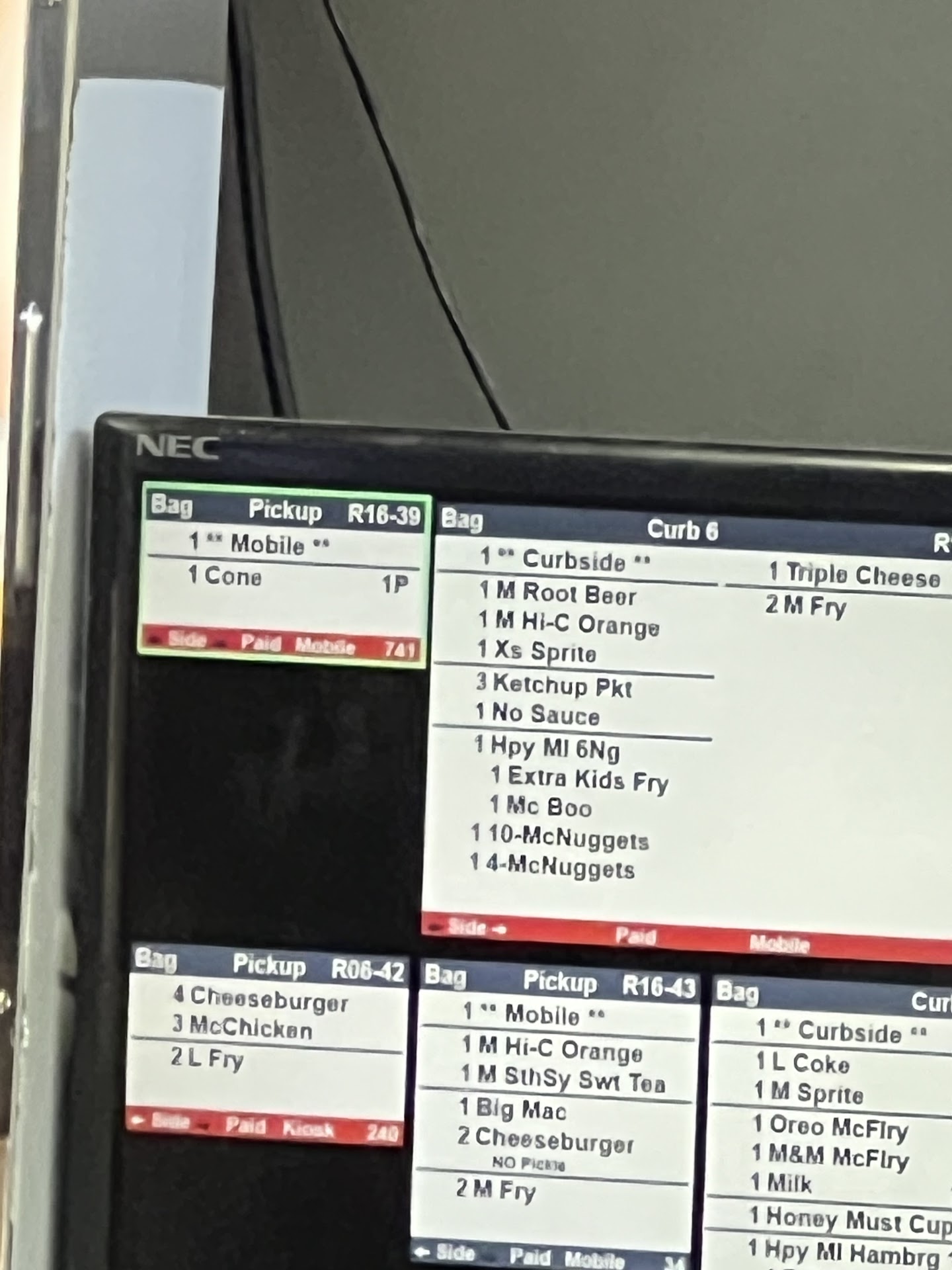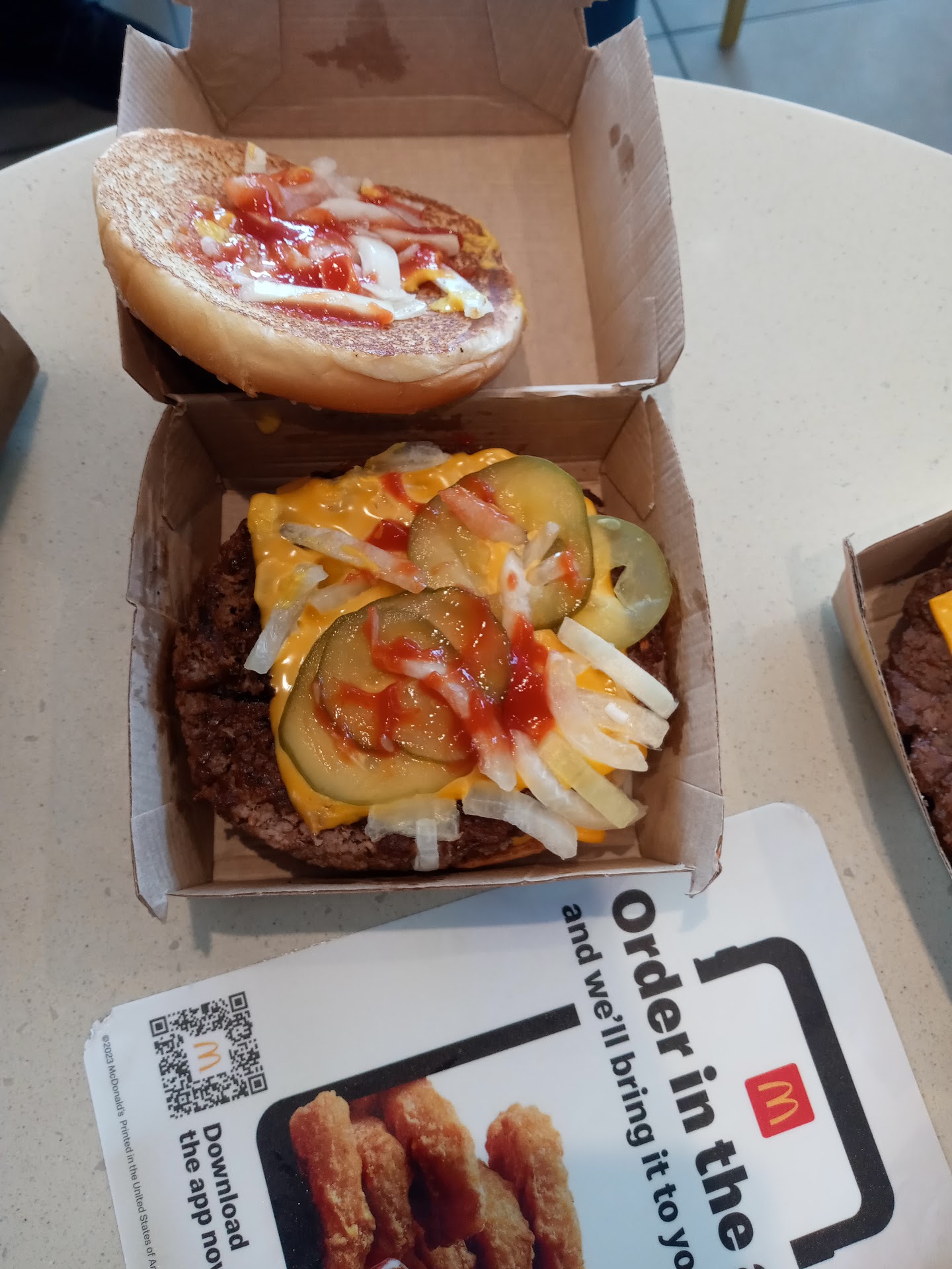 The only worthwhile employee working during our visit found our order in the system and entered it for us. The store was brightly decorated for Grimace’s birthday…which is the only compliment I can offer in this review. We took a seat. The employee who took our order came out to inform us the Coke freeze wasn’t working so we switched to a different flavor. He later brought out the food after a longer than average wait given we were one of only three tables in the restaurant.