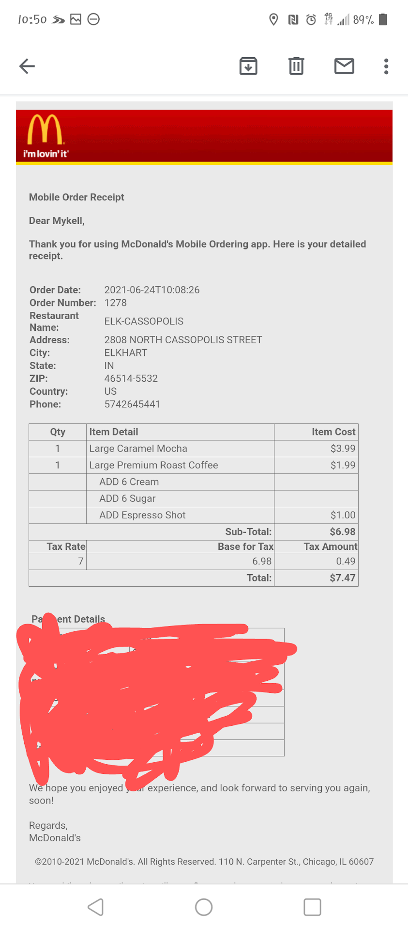 The kiosk allowed us to select an entire order before alerting us the payment station didn’t work. It then spit out a receipt for us take to the counter…but it was blank.