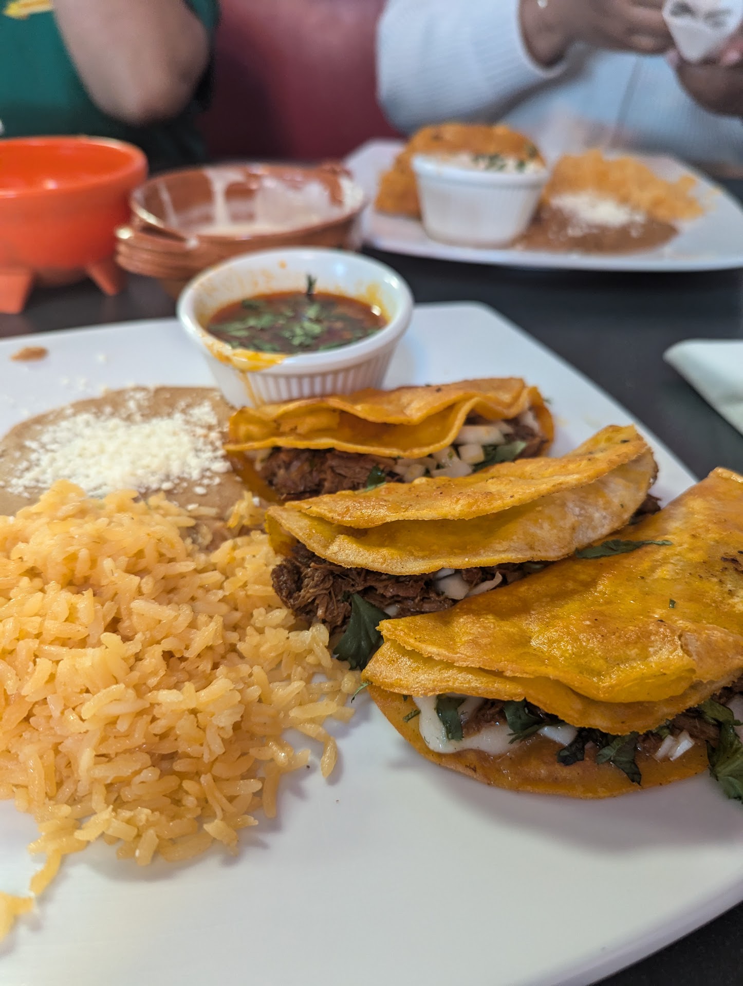 I payed $23.30 and got 3 quesabirria tacos, with rice and beans. 3 steak tacos. Order came with chips and salsa as well. Extremely fairly priced in my opinion. Steak street tacos are good. Didnāt get a salsa verde with them but I also didnāt ask. Tastes perfectly fine without any sauce. They are a little salty but I think that a what made me like it without a sauce. The salsa served with the chips was good, it was on the mild side. Quesabirria tacos are phenomenal, not dry which can happen at some restaurants. The rice is amazing, good flavor to it. The beans taste like beans (Iām impartial). The consomĆ© I think is the perfect size, at a different restaurant itās a bigger one and then you just get left with a lot left over. This is perfect.