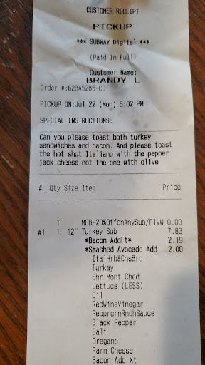 I ordered online a six inch tuna sandwich, specifically at this restaurant because it is close to my granddaughters place of employment and it would save on gas to have her pick it up on her way home. When she got home, she handed me the bag and it was a footlong sandwich. We joked about How the tag on it said our name and had our order of a six inch on it and they must have thought I was super hungry. When we opened it, it was roast beef with banana peppers and melted cheese. NOT what I ordered. We called them and the girl on the phone said my granddaughter picked up the wrong one, even when I told her that the tag Said our order and name on it. She them said they had my sandwich there if I wanted to come get it. So we drove back across town and when I told the girl this was supposed to have saved gas and asked if there was any amount of refund, she just laughed and Said, no but you got your sandwich. NEVER GOING THERE AGAIN AS THEY DON'T CARE ENOUGH TO EVEN TRY TO MAKE...