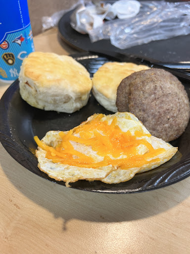 Food: The biscuits were soft and tasty (They could have used a little more butter on top after getting them out of the oven). The sausage was room temperature — it tasted like it had been sitting out in a tray rather than in the warmer or coming off the grill. The over-easy eggs were perfect; however, when asked and paid for cheese, there was hardly any cheese (looks like a little pinch — not worth the $0.30-0.40 extra). The Pancakes were not warm, but they were nice and soft (especially after adding the syrup and butter). For the pancakes to be made in the restaurant, they were slightly disappointing. An individual could tell they were cooked and sitting around until someone ordered them. The gravy was a little watery that I ordered on the side as well — it should be made thicker when whisking. I did not receive any jelly for my biscuits. I did not finish my meal. Rating: 3