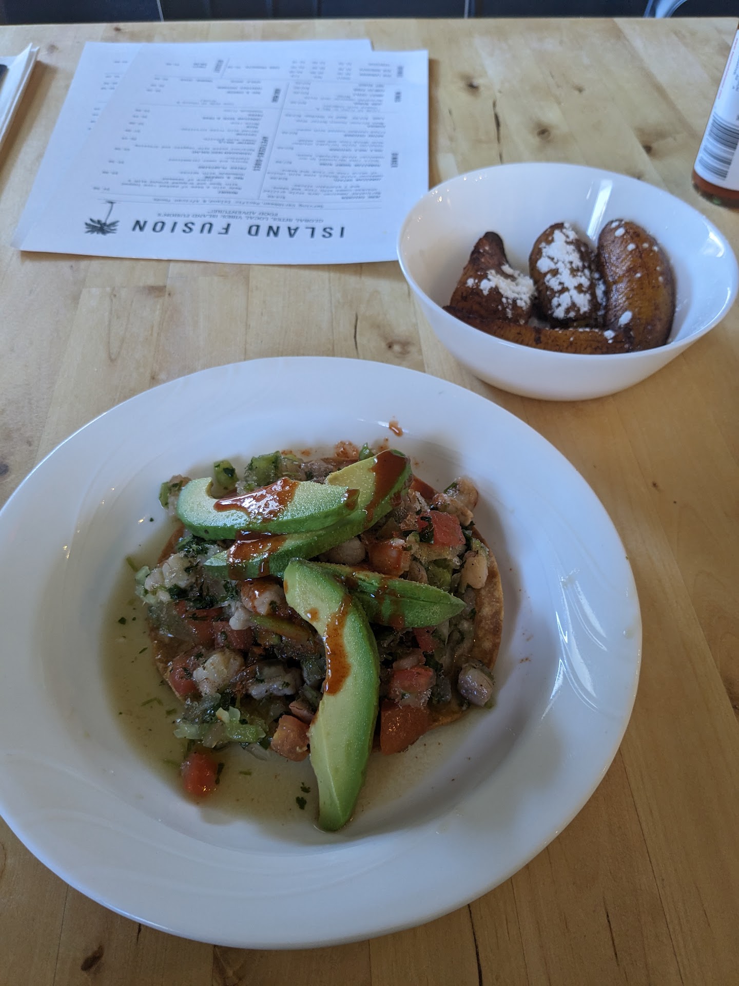 I ordered the ceviche and the fried plantains and was super impressed with both! I've had ceviche from other restaurants and hadn't been a fan. But here, every ingredient was so fresh and, well, refreshing! The tomatoes and cucumbers were the perfect texture, the avocado was perfect, and the shrimp was deliciously juicy. The crisp tortilla wasn't soggy in the slightest, despite the generous helping of delicious lemon juice, cilantro, and spices. All the flavors blended together super well. This place single-handed changed my mind on this dish.