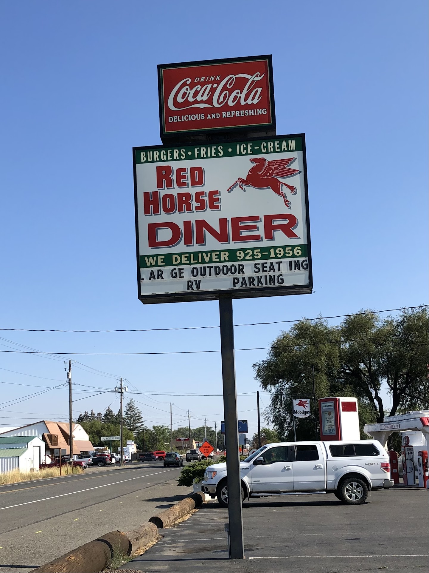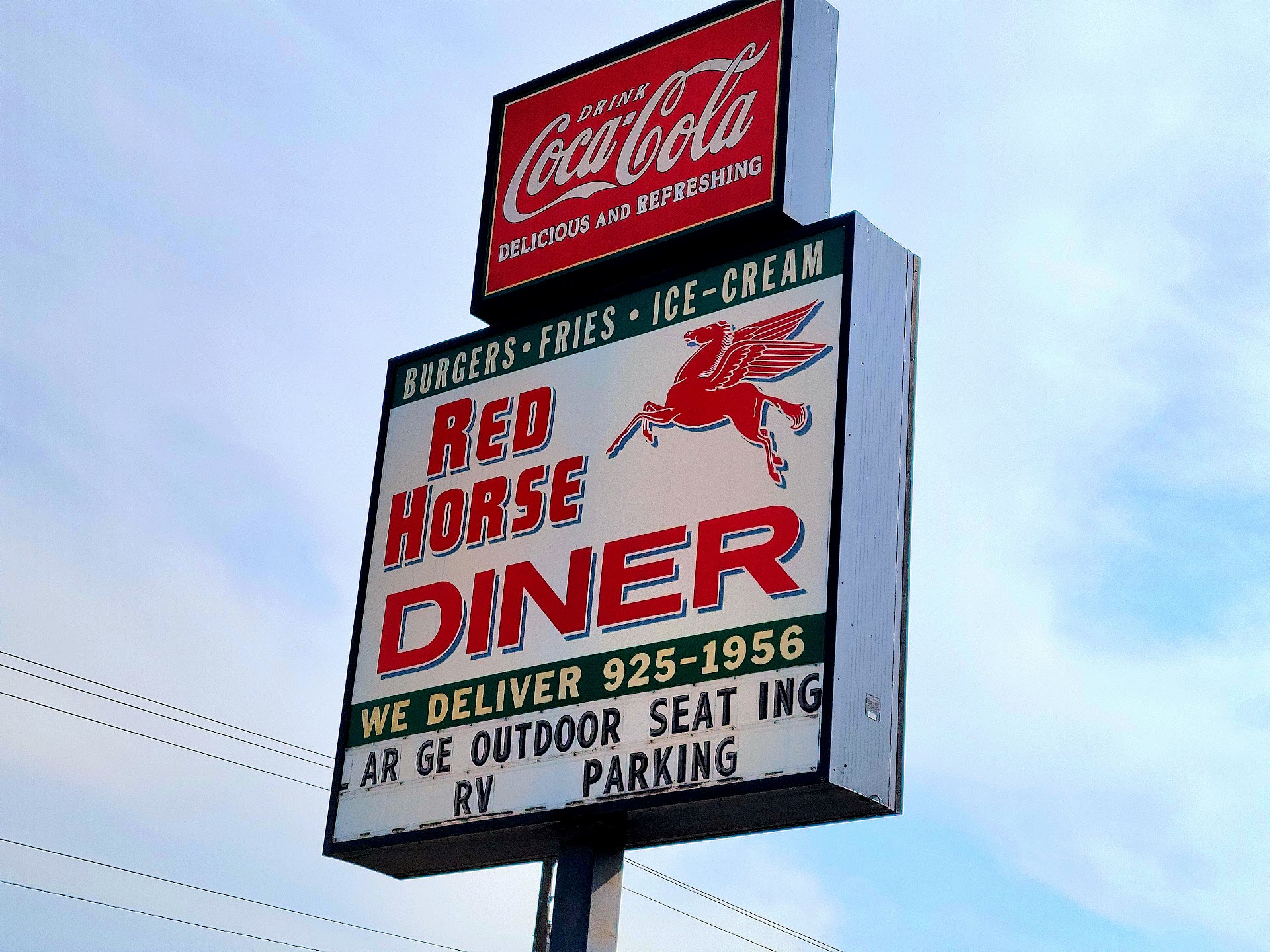 Read moreAlways looking for something interesting when we are on the road, I researched a dozen places between Ellensburg and Moses Lake, WA, and decided the Red Horse Diner might work out. Here we were on a lame Wednesday evening about 7 pm and found the glowing lights and signage that looked like a hint of yesteryear. We parked, opened the narrow restaurant door and found a compact lil diner, like from a scene out of a Lifetime movie or a Stephen King novel, depending on your point of view. A gal said hello and told us we could sit anywhere on the left side of the place, so we chose a half booth facing not only the parking lot (to keep an eye on our vehicle) but also with a good view of a rodeo program on a tv mounted high up on the wall. Of course, there were also plenty of vintage signs to read, no matter where you might choose to sit! One iced tea, one rocks margarita. Shared some jalapeno poppers, a 409 Burger and some sweet potato fries for a cost of $42. Not cheap, but that's how it is these days. Anyway, the burger was decent, the fries good, the poppers all right. Not gourmet, but real American road food, fried and all that, you know what I mean. Service was good, not intuitive, but good. Booth seating surfaces in dire need of something better than a duct tape fix for the rips in the vinyl. Decor was the best thing because for us oldsters it was memory lane. Enjoyed remembering all the times and places we had seen so many of the signs. Of note: Good parking lot so if you're driving a rig, RV or towing a boat, it might be kinda nice to stop here for the easy parking Fairly clean restrooms. Fun Bulletin boards you can peruse for hours if you feel like it. Overall, yup....