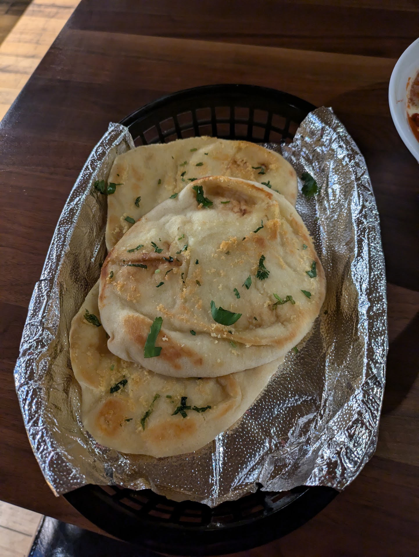 I had the chicken tikka masala, garlic naan, and the gobi manchurian. The gobi manchurian was crispy on the outside and covered with a tangy sweet sauce. The tikka masala was rich with very tender chicken and just a hint of spice (I asked for medium). The garlic naan was crispy but somehow also fluffy. It was different from other naan I have had in the past. The food came out quickly, was hot, and tasted delicious.