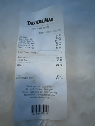 Upon entering, we werenât greeted- the female worker seemed to have an attitude like she wasnât interested in working. The first thing that they told us was that they were out of chicken, pork & ground beef. Which is fine because we came for the Baja burrito (fish). She asked me which tortilla I wanted for it & I asked her what my options are for the tortillas and she just told me to read it on the glass. I inquired about how the tomato tortilla tasted and she said âI donât know. I never tried itâ The service is rude here. With the exception of the cashier with long curly hair pushed back with the bandana- he seemed to be in a good mood and wrote a smiley face on my burrito so i could tell which was mine from my partners.