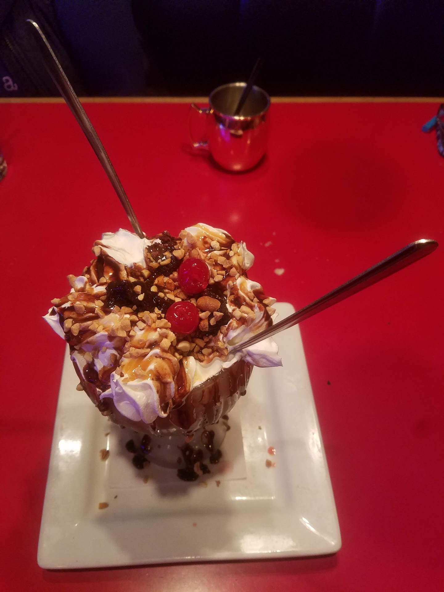 Finished our meal with the Roadhouse Sloppy Sundae which was a big hat no cattle sundae: 1/4 of the sundae was just whipped cream, then ice cream w/ice crystals, no caramel or chocolate sauce in the sundae itself (it was drizzled on the whipped cream and mostly over sides of the dish), and a hard brownie at the bottom.