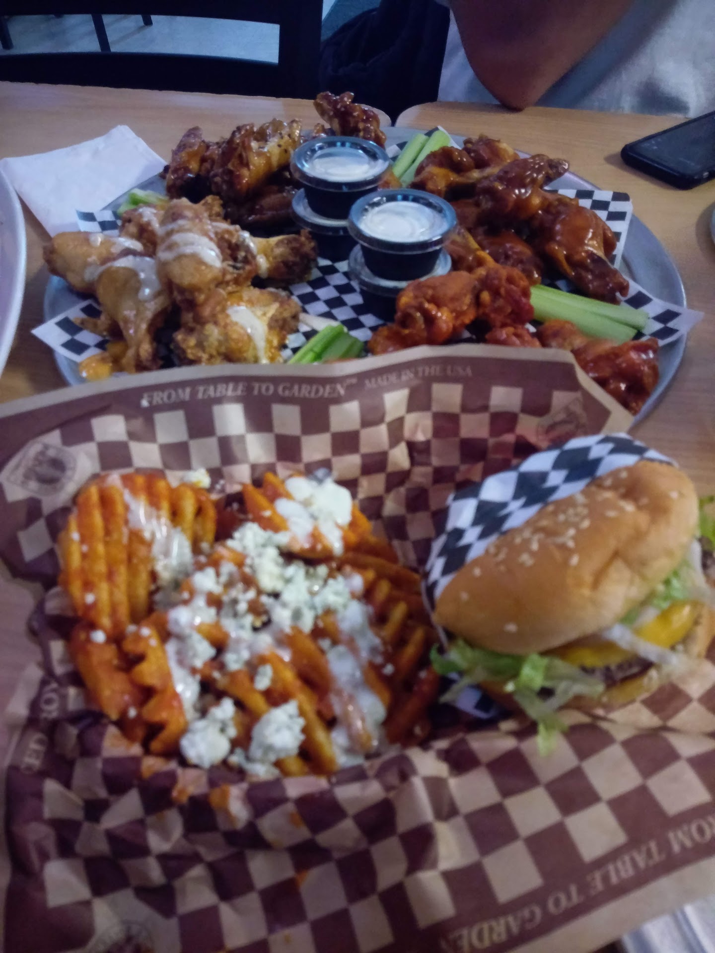The staff was great! Did I mention the staff was great?! We placed our order and the food arrived shortly thereafter. Nachos, Wing Central Burger and four flavors of wings. Spicy garlic, 2nd degree, Teriyaki and spicy Thai peanut. All of the flavors were as described by their flavor name and the wings were flavored with the flavors perfectly. The food was great, the service was great and the atmosphere was fun!