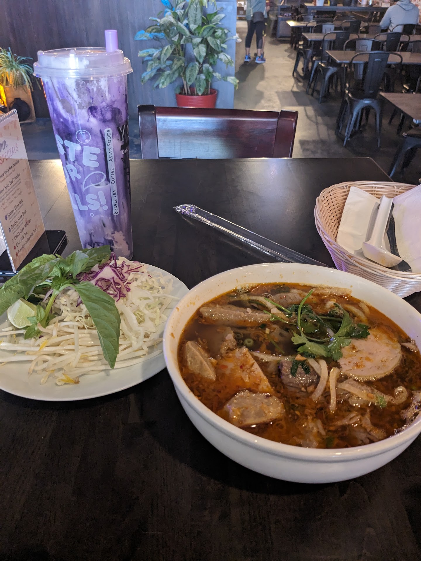 Pictures with this review is the Vietnamese beef noodle soup. This is a soup with a rich, spicy broth, plenty of noodles, and oodles of beef, Vietnamese ham, and Vietnamese sausage. It also comes with a huge plate of veggies to add to your heart's content (I love to add the cabbage and some of the jalapenos, while eating the bean sprouts on the side!).