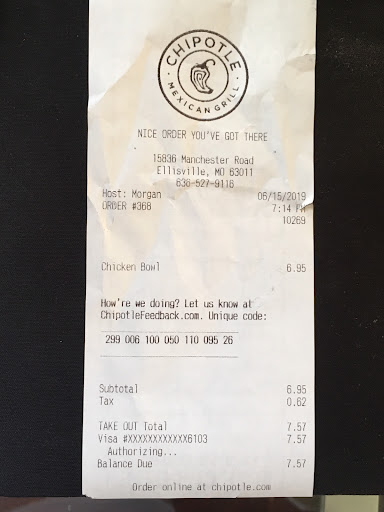 Read moreI am a loyal customer of Chipotle because it is one of the only places around that has fast and healthy food that I don’t have to cook myself. My husband and I go at least once a week, so the employees recognize us. You’d think that they’d want to keep us as loyal customers, but every single time we go I watch as they pile on food on the online orders and give me about a third of a serving of rice, beans AND chicken. I ALWAYS have to tell them I need more. But GOD FORBID you ask for more meat, as that is an up-charge.The portions are MAYBE acceptable for a small child. I am at the point that I am willing to drive all the way up Manchester to the Des Peres location due to constantly being ripped off AND having to wait countless minutes for the online orders to be filled in front of us before they finally decide they should serve the people who were actually not too lazy to get out of their houses to walk in and order their food in person. Management needs to figure out how to fix the catastrophe that is ordering food at chipotle. I realize it is not the employees fault that they have to fill online orders, but they could at least be understanding that we are paying for food, so expect to get enough. They could also have the decency to apologize for long waits or at least thank us for our patience. Clearly this place cannot handle online orders as well as in person orders seeing as they regularly have to close to fill online orders only. Which is doubly infuriating. I’m so over the disappointment. It’s obviously too much to ask that this place provides a decent experience after the umpteenth time of going. I wish I could give 0 stars....
