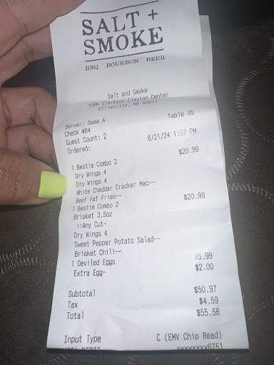 Read moreI visited on Friday Oct. 17th at 7pm. The hostess was pleasant and even made sure we got a table we liked. Once seated our server came up to us and gave us menus and got our drink order. The server even said she will grab silverware for us; spoiler alert: we never received silverware or napkins even when asked. We got our drinks and placed an order for chicken skins as an appetizer, they came out fast. Once the server came back to take our order: I ordered the brisket but the brisket was out. Not a big deal as it was late in the day but the server never mentioned it to us when we sat down. we would of liked a little heads up that is all. So we said we needed another minute to look over the menu as everyone there wanted brisket. The server did not refill our drinks and was missing for over 25 minutes. We had to track her down. We decided we would place some to-go orders instead since the service was absent. She got our to-go orders and we waited for about 8 minutes for it. We ordered loaded fries and regular fries along with burnt ends toasted ravioli. that's it. when our order came out to us the regular fries were ice cold and the loaded fries were pipping hot. We also got another order for chicken skins we did not order. We had to track down our server again to explain the issue. She apologized and fixed the problem. We asked for refills as its been 40+ minutes and never got refills and our drinks were empty. We got our refills and waited 15 minutes for the fries to be done. We ended up eating our to-go meals at the table while waiting for the fries. When the fries arrived we asked for the bill. We have four people (two couples) so we split the bill. The server handed us a device and walked away. We paid for one half of the bill and didn't know how to access the device for the other half of the bill. We had to track our server down again. When paying for the other half of the bill it said remaining balance was $6. When we asked about that she said she split the check wrong and we had to be charged again. She ended up fully charging us for everything including the extra chicken skins we did not order. We never got a receipt even though we asked for it. I walked around the place and only say 5 tables with people. They were not busy and yet we got service like they were. Never...