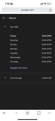 Edit: owner replied claiming hours of operation I have never seen. I work until 10pm Monday, Wednesday and Friday and until 10:30om on Saturday and Sunday and I drive past this establishment everyday on my drive home. Maybe twice a month they will still be open on a Saturday until 11pm but they are never open on a weekday past 10pm. Even when lights are on and cars are in the parking lot if you pull up to order you will either sit forever or they will rudely tell you they’re closed. I once pushed back on this saying I thought they were open until Midnight and the two employees that were sitting at the outdoor tables laughed at me and said they close at 10pm. It’s possible the owner may need to actually visit this restaurant around closing time because they are obviously not aware of (or are simply lying about the fact) that they are rarely open past 10pm and most nights never turn on their outside lights so it’s hard to tell if it’s open at all after dusk. They also didn’t address the issues with my orders being wrong multiple times, you have to go out of your way to add just sour cream to all my REGULAR tacos (and I checked the receipt they were regular tacos and I did fill out an official survey) The owner should be more concerned that customers are receiving the wrong food/ quality that is worst than what you expect from Taco Bell and I work in the service industry I’m not expecting much! Instead all they want to incorrectly correct me on is their hours? The owners obviously have a lot of internal work to do. Both with them actually being present and aware of how this location operates and in their priorities with their customers. The owners response alone is making me wish we could give negative star reviews. Unbelievable. Attaching a photo of their current hours according to Google which is even more restricted than I mentioned. Probably to give those employees wiggle room when no one is willing to work til midnight (and I don’t...