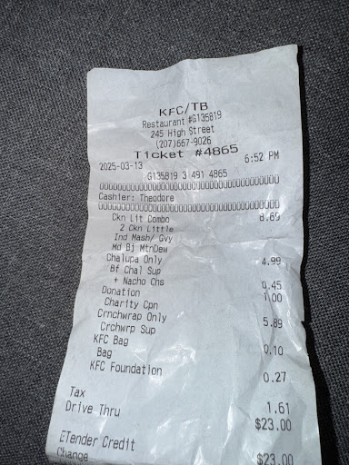 Read moreUPDATE:(8/07/24): The Colonel would roll over in his grave. This location REALY needs new management, or Ellsworth needs a Popeye's! Sadly, anyone looking for fried chicken at a good value should probably look elsewhere. Recent visits to this location have been a sharp reminder of how important good culture is to any organization. Food is very rarely fresh. Most of our last order had to be thrown out. The chicken was so old that the coating had all fallen off, and it was not hot. I half suspected they dug it out of the expired/toss out bin. They are VERY upset by large orders. Customers with large orders are frequently turned away or told they dont have enough chicken and it the customer will have to wait 45 minutes to get their order. If you persist, expect to have the shift leader come to the front to stare you into leaving, followed by having your order nearly thrown at you. Also, do not expect to be treated well. There is NEVER a manager higher than a shift leader on site, so there is no one to complain or appeal to and the ownership of the franchise, to spite their contact Info on the wall is deliberately impossible to reach for customer service complaints. I have removed the comments from my previous review regarding the staff. Regrettably, that has turned for the worse as well. As I've stated, large orders are met with anger and rude behavior and complaints. Ellsworth really needs a Popeye's.