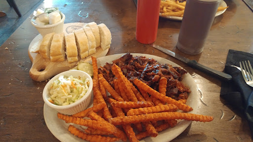 No parking in front of the restaurant and there are signs in front of the building next door stating the parking is for those in that building. I believe parking is in back but you have to down a steep drive. I didn't see a ramp for wheelchairs in the front either and the bathrooms have an odd entry making it non accessible. I had to change chairs 3 times because the chairs were extremely wobbly and I felt unsafe. I have been there several times and though it was slow, I found it hard to find a waitress or bartender.the food wasn't tasty, but the brisket was so over cooked the bottom was burnt and hard. The pork ribs were had more meat than those at Chili's but still give this cowboy themed restaurant another star. It's not handicap accessible in any way, i only saw stairs, no ramp and cramped bathroom entries. No way for a wheelchair to access the restroom because a small wall provides an access barrier. Back to food. Known for its BBQ I found this place disappointing in every way: menu, price, access and parking. It's a common bar.for the neighborhood, a drinking hole with food. The BBQ is not barbequed onto the meat but sits in a squirt container. That's a good thing because I didn't like their homemade recipe, too much vinegar and surprisingly boarding. I will go back with the hope that another try means it was just a bad day at this...
