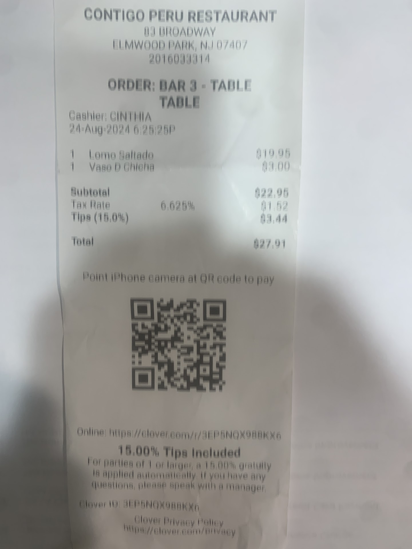 I went to this place recommended by a friend of mine. I have ordered the Lomo Saltado dish even though I thought the price was a bit high regardless if food was good it will be worth it. What a disappointment when the dish arrive. Letâs break down the dish the flavor was on point because has been flame however the meat was hard to chew. If a restaurant want to charge a higher price than other Peruvian restaurants they can do that however quality has to be on point. I will say flavor and preparation was good but the meat low quality. When I ask for âaji huacatayâ they say that they didnât have it. They make their own green sauce that doesnât have the flavor of the real thing. At the end of my meal I asked for my bill and I was surprised that the tip was imposed on my bill. I was a party of one and usually this rule is when they serve a table of six or more people. The tip is not obligation to demand from customers. I have worked in restaurants at one point of my life so I am a very good tipper because I understand servers. Very particularly the bill has a statement of you want to ask about this rule to speak to the owner/manager. Very disappointed about this and the meat in my...