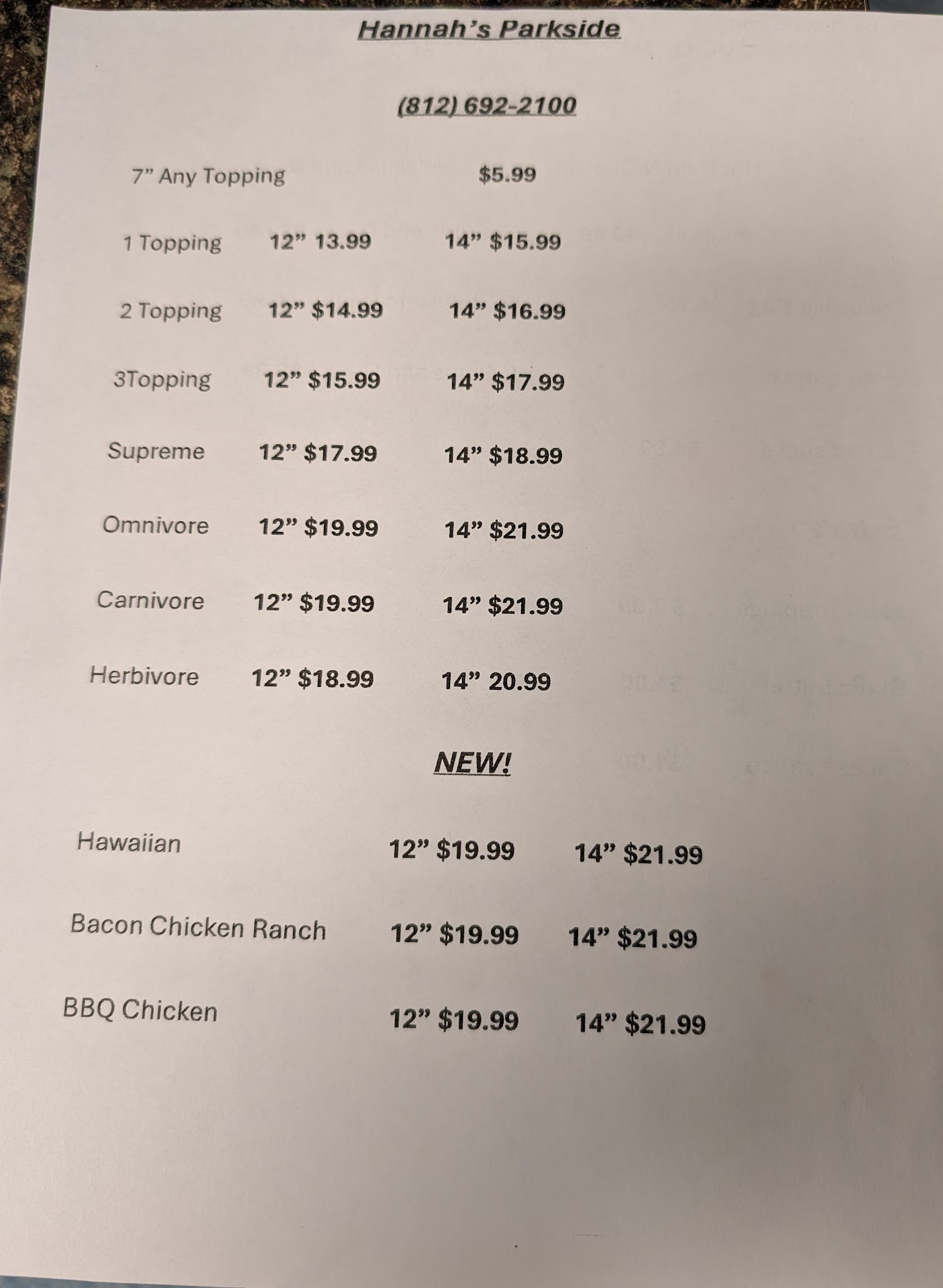 You ready for a different pizza experience? YOU HAVE GOT TO STOP BY HANNAH'S PARKSIDE. I have been watching this place on Facebook for some time now and finally was able to get there in person. It was not a disappointment. The staff even took time to set down and talk to us about their business and local events. Dont let the menu full you, this place is so much more. My personal opinion is this place is very comfortable and the pizza was spot on even when I had a...