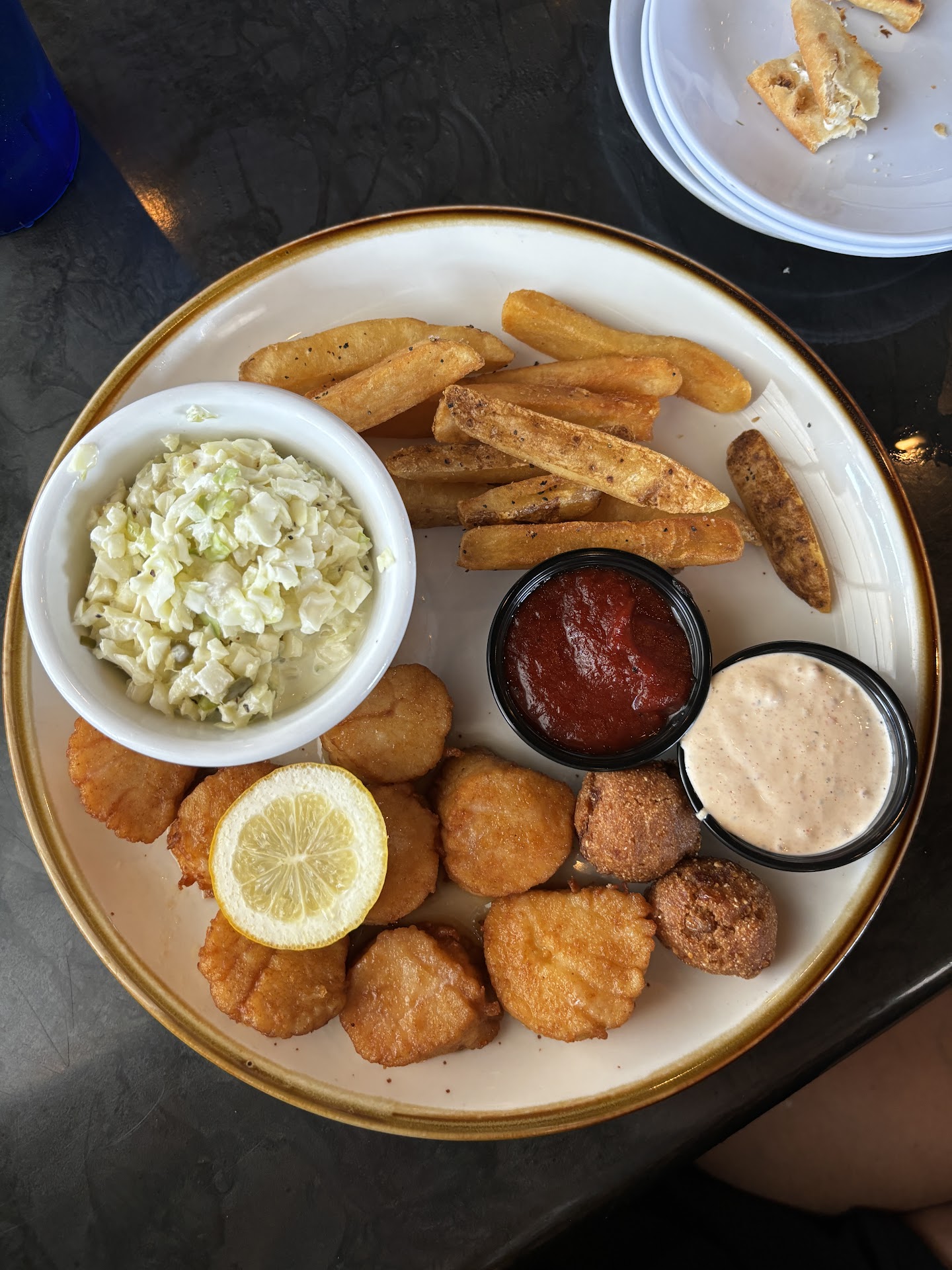 Our food came out and it was decently good. The Gaff sandwich was great but the platters both were meh and the shrimp platter was not that great. One of the platters (the fried platter) was supposed to come with oysters and they just decided to add extra fried shrimp instead of telling us there was no oysters. This was the only reason a party member ordered the platter and it was annoying it did not come as described.