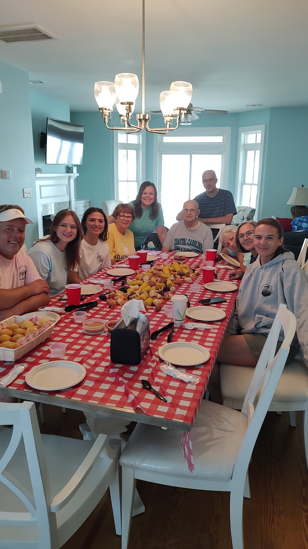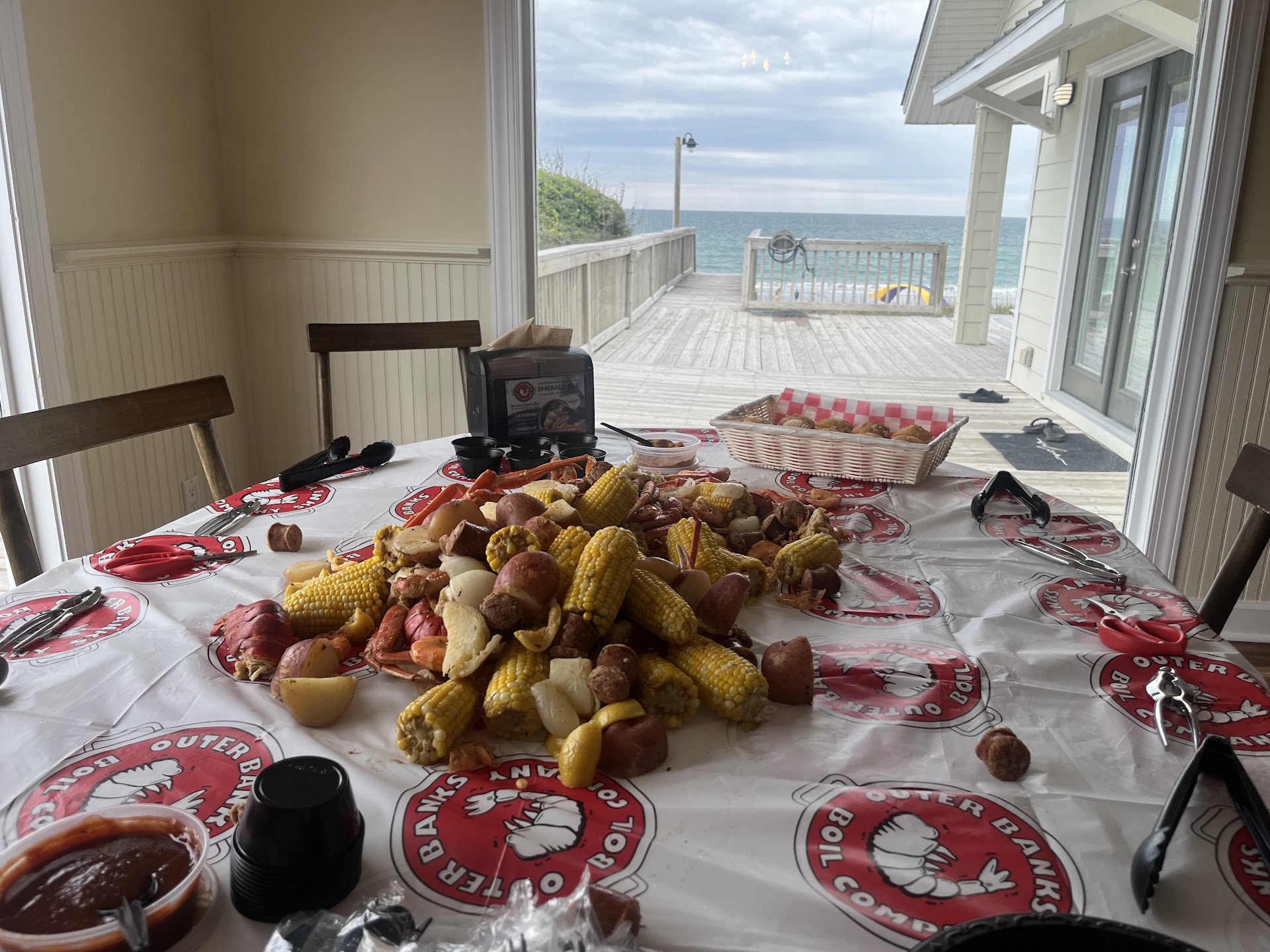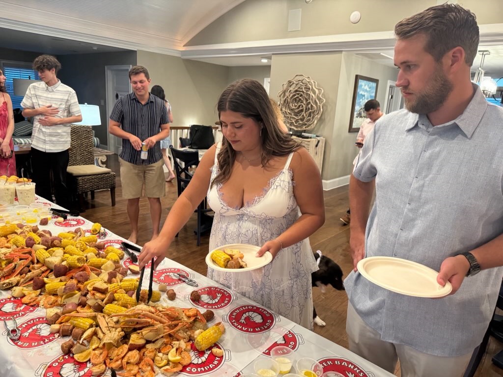 Outer Banks Boil Company came right to our house and made dinner feel like a party. They showed up with everything—big pots, burners, and all the good stuff: andouille sausage, potatoes, corn on the cob, and a mountain of peel-and-eat shrimp. They set up in our family room and got to work while we hung out around the dinner table, just soaking it all in.