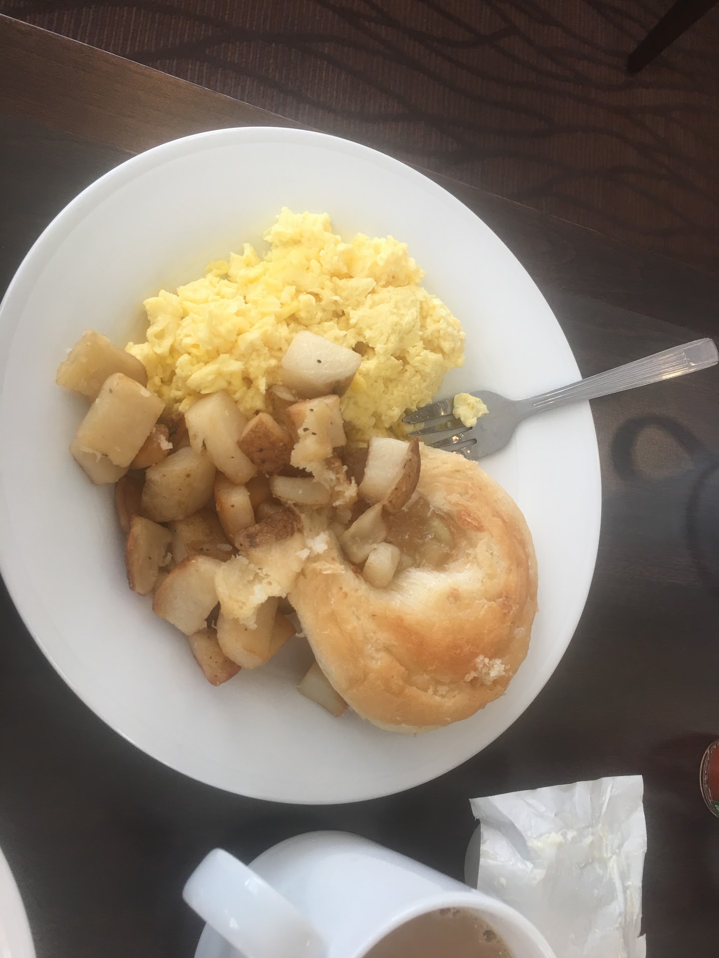 Breakfast buffet that includes scrambled eggs, potatoes, Sausage links, pork bacon, pancakes and waffle maker. Few pastries Nd not to forget they do by request only sunny side up or omelettes included in the Buffett price. OJ, milk and coffee. Overall if ur a guest just enjoy it. If ur a visitor for an event I guess it's your choice. I felt after a $15 parking and paying $17.99 for Buffett it was a bid high for not having more food choices. But again you could have gone across the street to Denny's and got less for more $$ and bad service.