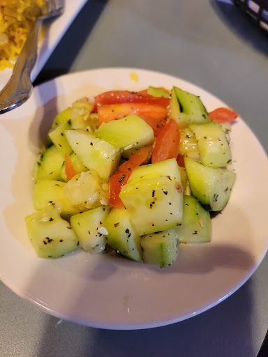 For the main course, we each ordered a kebab plate - she had chicken, and I had lamb. The marinade was also savory for both. The meat is thin, and a bit dry, but still good. Lots of rice. The veggies were still pretty crisp - peppers (yellow, green, and orange), and onions.